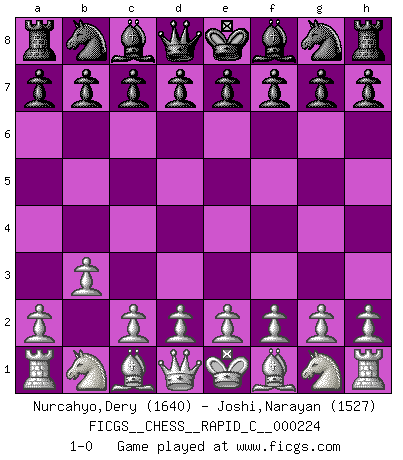 Last move : 1-0 2019 November 21 12:40:19 [Event "FICGS__CHESS__RAPID_C__000224"] [Site "FICGS"] [Date "2019.10.21"] [Round "1"] [White "Nurcahyo,Dery"] [Black "Joshi,Narayan"] [Result "1-0"] [WhiteElo "1640"] [BlackElo "1527"] 1.b3 1-0 This chess game has been lost on time (started : 2019.10.21 15:40:35) Nimzovich-Larsen attack Player White won this chess game. Follow this game move after move (download)What is the difference between chess and football? Everybody understands football, but nobody plays it. Everybody plays chess, but nobody understands it. Everything is relative. (Vladimir Kramnik) Ohne ihre Erfolge schmälern zu wollen würde ich sagen Petrosian, Spassky und Karpov verdanken ihre Siege ihren Trainern - Boleslavsky, Bondarevsky und Furman. (Mikhail Moiseyevich Botvinik) En el Ajedrez, cuando menos, el valiente hereda la tierra. (Edmar Mednis) On est toujours la mazette de quelqu'un d'autre. (Anonyme) Convictions are more dangerous enemies of truth than lies. (Friedrich Nietzsche)