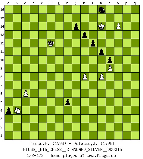 Last move : 1/2-1/2 2020 March 6 19:54:16 [Event "FICGS__BIG_CHESS__STANDARD_SILVER__000016"] [Site "FICGS"] [Date "2019.10.21"] [Round "1"] [White "Kruse,Herbert"] [Black "Velasco,Jose Maria"] [Result "1/2-1/2"] [WhiteElo "1999"] [BlackElo "1798"] 1.j2-k4 h15-g13 2.h2-g4 j15-k13 3.p1-o3 e15-e13 4.b1-c3 d15-d13 5.e2-e4 f16-b12 6.h1-o7 b16-c14 7.o7-o15 m15-m13 8.o15-o9 n15-n13 9.f1-b5 l15-l14 10.m2-m4 o16-f8 11.g1-j2 l16-p12 12.k1-h2 h16-m12 13.l1-p5 k16-h15 14.d2-d3 c16-l8 15.c1-l9 m16-o16 16.o9-j4 p16-o14 17.n2-n3 g16-j15 18.o1-f9 m12-m7 19.j4-m7 l8-m7 20.e1-e3 f15-f14 21.e3-f3 o14-n12 22.m1-m3 p12-k7 23.f9-g10 k7-g10 24.b5-g10 g13-e12 25.m3-l3 h15-g13 26.l3-l7 m7-n8 27.f3-f5 n8-j12 28.g10-j12 g13-j12 29.q1-m1 n12-o10 30.l7-d7 d13-d12 31.m1-m3 o10-m11 32.l9-m8 o16-o9 33.m3-l3 q16-o16 34.l3-l8 f8-k12 35.h2-k3 j12-g13 36.j1-h2 k12-j13 37.d7-q7 q15-q14 38.l8-l10 m11-n9 39.l10-n10 n9-o11 40.n10-p10 o11-p13 41.m8-k10 j13-l11 42.k10-l11 k13-l11 43.a1-e1 j16-h15 44.e1-e3 o9-b9 45.f5-b5 b9-b5 46.c3-b5 o16-o13 47.e3-f3 e16-o16 48.f3-f7 l11-m9 49.p10-b10 a15-a13 50.k3-l5 o16-o15 51.a2-a4 m9-n11 52.q2-q4 n11-l12 53.l2-l3 a16-o16 54.k4-m3 o13-o10 55.b10-o10 o15-o10 56.k2-k4 o16-o11 57.f2-f4 p13-n14 58.q7-p7 n14-p13 59.j3-j4 b12-e9 60.f7-b7 b15-b14 61.c2-c4 c14-b12 62.b2-b3 e9-j13 63.p7-h7 o11-d11 64.d3-d4 p13-o11 65.d4-d5 q14-q13 66.e4-e5 p15-p13 67.e5-e6 q13-q12 68.h7-o7 o10-h10 69.j2-g3 j13-m10 70.g3-h5 n13-n12 71.f4-f5 d11-f11 72.f5-f6 f11-h11 73.l5-j6 c15-c13 74.m3-l5 h10-g10 75.h5-g7 j15-k13 76.o3-n5 e12-c11 77.j4-j5 b14-b13 78.p2-p3 a13-a12 79.l5-k7 m10-l11 80.n5-l6 g10-l10 81.k4-k5 h11-f11 82.h2-j3 l11-k10 83.p5-k10 l10-k10 84.j6-h8 f11-f10 85.j5-j6 k10-o10 86.k7-m8 o10-h10 87.m8-k9 h10-o10 88.g7-e8 o10-o7 89.b7-o7 f10-p10 90.f6-f7 p10-e10 91.n3-n4 e10-e12 92.n4-n5 e12-g12 93.o7-g7 g12-e12 94.g7-p7 e12-e10 95.o2-o4 b12-a10 96.g4-f6 a10-b8 97.e8-c7 c11-d9 98.c7-d9 b8-d9 99.f6-e8 d9-e7 100.g2-g4 c13-c12 101.o4-o5 b13-b12 102.l3-l4 a12-a11 103.o5-o6 b12-b11 104.q4-q5 c12-c11 105.p3-p4 a11-a10 106.p4-p5 e7-c8 107.a4-a5 c8-a9 108.e8-d6 a9-c10 109.q5-q6 c10-b8 110.b5-c7 e10-d10 111.d6-b5 k13-j11 112.k9-j11 l12-j11 113.g4-g5 d10-h10 114.j6-j7 j11-g10 115.h8-g10 h10-g10 116.h3-h4 g13-h11 117.p7-p8 a10-a9 118.j3-j4 b11-b10 119.p5-p6 h11-j9 120.q6-q7 g10-f10 121.p6-p7 j9-h7 122.l4-l5 h7-f8 123.p8-g8 f8-d9 124.c7-d9 b8-d9 125.g8-e8 d9-b8 126.b5-c7 f10-c10 127.e8-e7 c10-c9 128.h4-h5 b8-d9 129.c7-d9 c9-d9 130.e7-b7 d9-c9 131.q7-q8 o11-q10 132.g5-g6 p13-p12 133.e6-e7 p12-p11 134.e7-e8 q10-o11 135.b7-b6 q12-q11 136.b6-c6 c9-c6 137.d5-c6 q11-q10 138.j4-j5 p11-p10 139.j5-k6 p10-p9 140.q8-p9 o11-p9 141.k6-l7 h15-j15 142.l7-m8 p9-o11 143.m8-m9 j15-k14 144.m9-n10 k14-l13 145.l6-m8 l13-m12 146.k5-k6 g15-g13 147.o6-o7 f14-f13 148.o7-o8 f13-f12 149.m8-o9 m12-n13 150.n10-o10 n13-o12 151.o10-p10 h14-h13 152.o9-q10 o11-m10 153.q10-o9 m10-k9 154.p7-p8 k9-j11 155.p8-p9 j11-g10 156.p10-o10 g10-f8 157.p9-p10 f8-e6 158.p10-p11 o12-p12 159.o9-n11 p12-p13 160.n11-l10 e6-f4 161.l10-j9 f4-h5 162.j9-h11 h5-k4 163.n5-n6 p13-p12 164.h11-g13 k4-l6 165.m4-m5 l6-j5 166.g6-g7 j5-g6 167.f7-f8 g6-e7 168.c6-c7 e7-c6 169.a5-a6 a9-a8 170.g13-f11 c6-a5 171.f11-e13 a5-b3 172.e13-c14 a8-a7 173.c14-d12 b3-c5 174.d12-e10 c5-a6 175.e10-f12 a6-c7 176.f12-e10 a7-a6 177.e10-d8 c7-e8 178.g7-g8 a6-a5 179.d8-c6 a5-a4 180.c6-b4 e8-f6 181.g8-g9 f6-h7 182.f8-f9 h7-g9 183.o10-n11 l14-l13 184.n11-m10 p12-p11 185.m10-l10 p11-o11 186.l10-k9 o11-n11 187.k9-j9 n11-m12 188.j9-h9 g9-f11 189.h9-g10 f11-d10 190.f9-f10 m12-l12 191.f10-f11 l12-k12 192.f11-f12 k12-j13 193.g10-f10 j13-h14 194.f10-e10 h14-g14 195.e10-d11 d10-f9 196.d11-c11 f9-g7 197.c11-b10 g7-j6 198.c4-c5 j6-l5 199.c5-c6 l5-j4 200.k6-k7 g14-f13 201.b10-c11 f13-f12 202.c11-d10 f12-e12 203.d10-e10 j4-l3 204.m5-m6 l3-k5 205.m6-m7 k5-j7 206.e10-f10 j7-k9 207.n6-n7 k15-k13 208.f10-g9 k9-m10 209.g9-h9 m10-o9 210.n7-n8 o9-m8 211.h9-j8 n12-n11 212.j8-k8 m13-m12 213.k8-l8 m8-o7 214.k7-k8 e12-f12 215.m7-m8 o7-q8 216.l8-m9 q8-o7 217.o8-o9 h13-h12 218.n8-n9 m12-m11 219.o9-o10 n11-n10 220.m9-l9 l13-l12 221.o10-o11 o7-p9 222.o11-o12 p9-q11 223.o12-o13 q11-p13 224.l9-m10 h12-h11 225.m10-n11 h11-h10 226.n11-o12 p13-q15 227.o12-p12 h10-h9 228.p12-q13 q15-o16 229.q13-q14 h9-h8 230.q14-p15 o16-m15 231.p15-o15 m15-l13 232.o15-o14 h8-h7 233.o14-n13 h7-h6 234.n13-m13 l13-m15 235.m13-n14 m15-o16 236.n14-o15 o16-m15 237.o15-n14 m15-l13 238.n14-m13 l13-k15 239.m13-n14 h6-h5 240.o13-o14 k15-m16 241.n14-n15 m16-l14 242.n15-m14 l14-m16 243.m14-n15 m16-l14 244.n15-m14 l14-m16 1/2-1/2 Follow this game move after move (download)Nowadays, when you're not a grandmaster at 14, you can forget about it. (Anand Viswanathan) Die Elozahlen sind sehr schlecht für das Schach. Jetzt ist Schach eine Sportindustrie, die darauf zielt Elopunkte zu machen. (Miguel Najdorf) Todavía soy una víctima del Ajedrez. Tiene toda la belleza del arte y mucho mas. No puede ser comercializado. El Ajedrez es mas puro que el arte en su posición social. (Marcel Duchamp) Les Cavaliers se révèlent fort utiles dans les positions fermées. D'habitude, les Fous sont un peu plus forts que les Cavaliers dans les positions ouvertes. Qu'on le veuille ou non, il restera toujours des exceptions ! You lose, general Kenobi. (General Grievous in Star Wars ep.3)