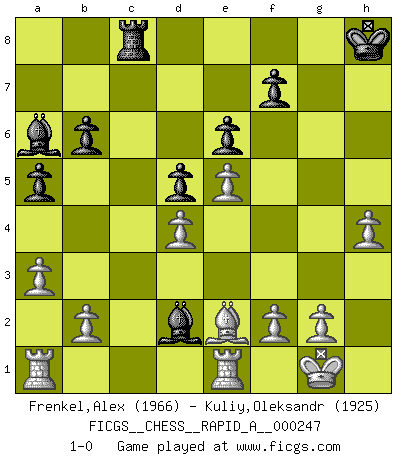 Last move : 1-0 2019 December 2 10:30:39 [Event "FICGS__CHESS__RAPID_A__000247"] [Site "FICGS"] [Date "2019.10.22"] [Round "1"] [White "Frenkel,Alex"] [Black "Kuliy,Oleksandr"] [Result "1-0"] [WhiteElo "1966"] [BlackElo "1925"] 1.e4 e6 2.d4 d5 3.Nd2 Be7 4.Bd3 Nf6 5.e5 Nfd7 6.Ne2 c5 7.c3 Nc6 8.Nf3 b6 9.O-O a5 10.Nf4 O-O 11.Qc2 h6 12.Qa4 Bb7 13.Bb1 Re8 14.Re1 Rc8 15.a3 Ba6 16.Be3 Nf8 17.Qd1 Qc7 18.Nh5 Ng6 19.h4 cxd4 20.cxd4 Qd8 21.Nh2 Bf8 22.Ng4 Kh8 23.Nhf6 Nce7 24.Nxh6 gxh6 25.Bg5 Ng8 26.Nxg8 hxg5 27.Nf6 g4 28.Qxg4 Bh6 29.Bxg6 Rg8 30.Nxg8 Qxg8 31.Bh5 Qxg4 32.Bxg4 Bd2 33.Be2 1-0 French : Tarrasch Kingside Castling by player White (move 9) Kingside Castling by player Black (move 10) Player White won this chess game. Follow this game move after move (download)If you aren't afraid of Spassky, then I have removed the element of money. (Jim Slater) Im Reiche der Wirklichkeit ist man nie so glücklich wie im Reiche der Gedanken. (Arthur Schopenhauer) La enorme capacidad mental, en la que sin ella no puede un jugador de Ajedrez existir, es demasiado requerida por el Ajedrez al grado de que nunca podrá liberar su mente de este juego. (Albert Einstein) Les échecs sont plus proches de l'art de l'assassinat que de l'art de la guerre. (Arturo Perez-Reverte) If you know the enemy and know yourself you need not fear the results of a hundred battles. (Sun Tzu)