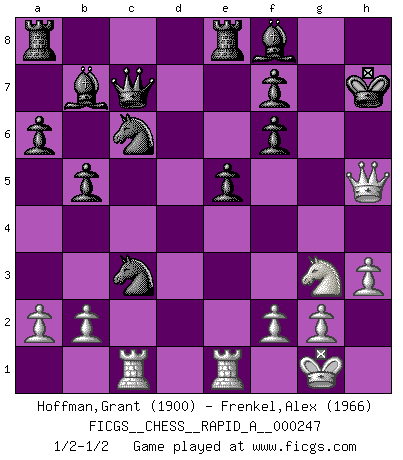 Last move : 1/2-1/2 2019 December 2 1:14:23 [Event "FICGS__CHESS__RAPID_A__000247"] [Site "FICGS"] [Date "2019.10.22"] [Round "1"] [White "Hoffman,Grant"] [Black "Frenkel,Alex"] [Result "1/2-1/2"] [WhiteElo "1900"] [BlackElo "1966"] 1.e4 e5 2.Nf3 Nc6 3.Bb5 a6 4.Ba4 Nf6 5.O-O Be7 6.Re1 b5 7.Bb3 O-O 8.d3 d6 9.c3 Na5 10.Bc2 c5 11.h3 Bb7 12.Nbd2 Re8 13.Nf1 Qc7 14.Ng3 Bf8 15.Bg5 Nd7 16.Bd2 Nb6 17.Nh2 Nc6 18.Ng4 d5 19.d4 cxd4 20.exd5 Nxd5 21.Rc1 dxc3 22.Bxc3 Nxc3 23.Nf6+ gxf6 24.Bxh7+ Kxh7 25.Qh5+ Kg8 26.Qg4+ Kh7 27.Qh5+ Kg8 28.Qg4+ Kh7 29.Qh5+ 1/2-1/2 Ruy Lopez : Closed, 7...O-O Kingside Castling by player White (move 5) Kingside Castling by player Black (move 7) This chess game ended in a draw. Follow this game move after move (download)The isolated Pawn casts gloom over the entire chessboard. (Aaron Nimzovich) Ich kämpfe solange mein Gegner einen Fehler machen kann. (Emanuel Lasker) Bobby Fischer es el jugador de Ajedrez mas grande que jamás haya existido. (Ken Smith) Horreur, mais aussi harmonie suprême : qu'y avait-il en effet au monde en dehors des échecs ? Le brouillard, l'inconnu, le non-être... (Vladimir Nabokov) You can't play chess if you're groggy from pills. (Anatoly Karpov)