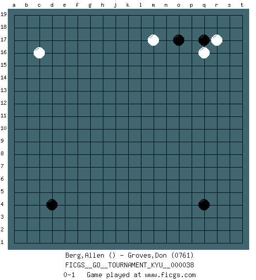Last move : 0-1 2007 August 3 19:57:7 [Event "FICGS__GO__TOURNAMENT_KYU__000038"] [Site "FICGS"] [Date "2007.06.27"] [Round "1"] [Black "Berg,Allen"] [White "Groves,Don"] [Result "0-1"] [Rating 2 "0761"] 1.d4 q16 2.q4 c16 3.o17 m17 4.q17 r17 0-1 This go game has been lost on time (started : 2007.06.27 9:16:58) Here are the names of the openings (joseki) played in the four corners : Corner q16 : q16 o17 Hoshi (Hwajeom, Seongjeom, Xingwei`) 4-4 Point. The star or hoshi (4-4) point, emphasizing influence at the potential expense of territory. Ikken Kakari (Hankan Keolch'im, Yi Gua`jiao~, 1-Space Low Approach). Black 2 is the standard approach move to the 4-4. Player White won this Go (weiqi, baduk) game. Follow this game move after move (download)Attach to the strongest stone in a pincer. (Anonymous) Who needs drugs and alcohol if he can play Big Chess at FICGS ? (Heinz-Georg Lehnhoff)