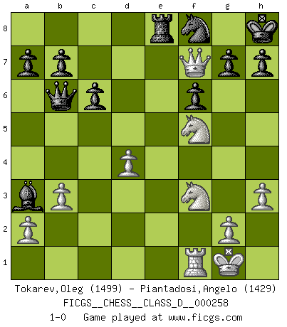 Last move : 1-0 2019 December 30 1:48:12 [Event "FICGS__CHESS__CLASS_D__000258"] [Site "FICGS"] [Date "2019.10.23"] [Round "1"] [White "Tokarev,Oleg"] [Black "Piantadosi,Angelo"] [Result "1-0"] [WhiteElo "1499"] [BlackElo "1429"] 1.e4 e6 2.Nf3 d5 3.exd5 exd5 4.d4 Nf6 5.Be2 Be7 6.O-O O-O 7.h3 c6 8.c4 dxc4 9.Bxc4 Re8 10.Be3 Nbd7 11.Nc3 Nf8 12.Ne5 Be6 13.Bd3 Nd5 14.Ne4 Nxe3 15.fxe3 f6 16.Nf3 Qb6 17.b3 Ba3 18.Qc2 Bf7 19.Ng3 Rxe3 20.Rae1 Rae8 21.Rxe3 Rxe3 22.Nf5 Re8 23.Bc4 Bxc4 24.Qxc4+ Kh8 25.Qf7 1-0 French defense Kingside Castling by player White (move 6) Kingside Castling by player Black (move 6) Player White won this chess game. Follow this game move after move (download)Even the laziest King flees wildly in the face of a double check ! (Aaron Nimzowitsch) Oft bringt ein stiller Zug das Erdbeben. (Richard Reti) Botvinnik trató de alejar el misterio referente al Ajedrez, siempre relacionandolo a situaciones de la vida diaria. Solía llamar al Ajedrez un problema inexacto típico, similar a aquellos en que la gente tiene siempre que resolver a cada día. (Garry Kasparov) Soyez une menace à chaque fois que vous vous asseyez pour jouer. (Ken Smith) Memory is a crazy woman that hoards colored rags and throws away food. (Austin O'Malley)