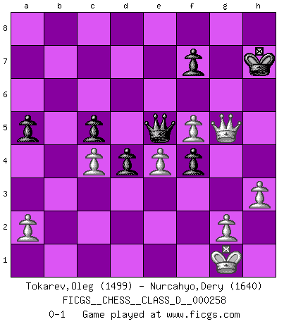Last move : 0-1 2020 June 23 8:26:43 [Event "FICGS__CHESS__CLASS_D__000258"] [Site "FICGS"] [Date "2019.10.23"] [Round "1"] [White "Tokarev,Oleg"] [Black "Nurcahyo,Dery"] [Result "0-1"] [WhiteElo "1499"] [BlackElo "1640"] 1.e4 c6 2.d4 d6 3.Nf3 Nf6 4.Nbd2 h6 5.Be2 Nbd7 6.O-O g5 7.Ne1 e5 8.c3 Bg7 9.Nd3 O-O 10.h3 Re8 11.Bf3 Qb6 12.Nc4 Qc7 13.Re1 b5 14.Nd2 Bb7 15.b3 Nb6 16.Nf1 a5 17.Ng3 Rad8 18.Nf5 Bf8 19.Bb2 Bc8 20.Qc2 Bxf5 21.exf5 Nbd5 22.c4 bxc4 23.bxc4 Nf4 24.Nxf4 gxf4 25.dxe5 dxe5 26.Bg4 h5 27.Bf3 Bb4 28.Red1 Rxd1+ 29.Rxd1 Bc5 30.Qe2 h4 31.Be4 Bd4 32.Bxd4 exd4 33.f3 c5 34.Qd3 Kh8 35.Rb1 Rb8 36.Rxb8+ Qxb8 37.Qd2 Qc7 38.Qf2 Nxe4 39.Qxh4+ Kg7 40.fxe4 Qe5 41.Qg5+ Kh7 42.Qh4+ Kg7 43.Qg5+ Kh7 44.Qh5+ Kg8 45.Qg5+ Kh7 0-1 This chess game has been lost on time (started : 2019.10.23 13:25:58) Caro-Kann defense Kingside Castling by player White (move 6) Kingside Castling by player Black (move 9) Player Black won this chess game. Follow this game move after move (download)It was clear to me that the vulnerable point of the American Grandmaster (Bobby Fischer) was in double-edged, hanging, irrational positions, where he often failed to find a win even in a won position. (Efim Geller) Es macht mich traurig, wenn ich sehe, dass Golfprofis mehr verdienen als Schachsportler. Obwohl ich davon überzeugt bin, dass wir Schachspieler viel härter trainieren müssen als die Golfer. (Alexandra Kosteniuk) El sobresalir en el Ajedrez es un signo de una mente intrigante. (Sir Arthur Conan Doyle) D'abord les bases : Jouez et étudiez, puis étudiez et jouez, ensuite jouez et étudiez, puis étudiez et jouez. Deuxièmement : Donnez toujours le meilleur de vous-même ! (Ken Smith) Methinks King Thibault should dub Marius Zubac a knight of the square board... I mean table, henceforth addressing him as Sir Marius, and bestow on him a suitable land from the kingdom of FICGS & marry him off to a worthy, fair maiden, lest he slice our heads with his mighty sword in his wrath. (Dinesh De Silva)