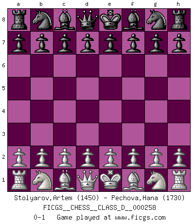 Last move : 0-1 2019 December 2 18:47:39 [Event "FICGS__CHESS__CLASS_D__000258"] [Site "FICGS"] [Date "2019.10.23"] [Round "1"] [White "Stolyarov,Artem"] [Black "Pechova,Hana"] [Result "0-1"] [WhiteElo "1450"] [BlackElo "1730"] 0-1 This chess game has been lost on time (started : 2019.10.23 13:25:58) Player Black won this chess game. Follow this game move after move (download)You may learn much more from a game you lose than from a game you win. You will have to lose hundreds of games before becoming a good player. (Jose Raul Capablanca) Verschiedene, sehr schätzbare und im Laufe des Lebens nützliche Eigenschaften des Geistes können durch das Schachspiel erworben und gekräftigt werden, so dass sie zu Gewohnheiten werden, die uns nie im Stich lassen. (Benjamin Franklin) Un mal plan es mejor que no tener ningún plan. (Frank Marshall) On n'a jamais que l'âge auquel on a commence à jouer aux échecs car après on cesse de vieillir. (Capablanca) In my experience, there's no such thing as luck. (Obi-Wan Kenobi in Star Wars ep.4)