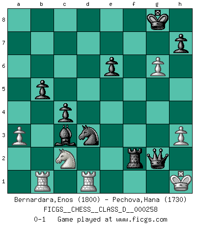 Last move : 0-1 2020 June 19 3:38:29 [Event "FICGS__CHESS__CLASS_D__000258"] [Site "FICGS"] [Date "2019.10.23"] [Round "1"] [White "Bernardara,Enos"] [Black "Pechova,Hana"] [Result "0-1"] [WhiteElo "1800"] [BlackElo "1730"] 1.e4 c5 2.c4 Nc6 3.Nc3 g6 4.Nf3 Bg7 5.g3 d6 6.Bg2 Nf6 7.d3 a6 8.O-O O-O 9.a3 Bg4 10.h3 Bxf3 11.Bxf3 Rb8 12.Rb1 b5 13.cxb5 axb5 14.b4 Nd7 15.Nd5 e6 16.Ne3 Nb6 17.bxc5 Na4 18.Bd2 Nb2 19.Qc2 Nd4 20.Qc1 Nxf3+ 21.Kg2 Nxd3 22.Qd1 Nxd2 23.Qxd2 dxc5 24.Rfd1 c4 25.Qc3 Bxc3 26.Nc2 f5 27.exf5 Qd5+ 28.f3 Qe5 29.fxg6 Rxf3 30.Kxf3 Rf8+ 31.Kg2 Rf2+ 32.Kg1 Qxg3+ 33.Kh1 Qg2+ 0-1 Sicilian defense Kingside Castling by player White (move 8) Kingside Castling by player Black (move 8) Player Black won this chess game. Follow this game move after move (download)No price is too great for the scalp of the enemy King. (Koblentz) Fallen sollten polizeilich verboten werden. (Savielly Grigorievitsch Tartakower) Mi estilo es algo parecido entre un poco de Tal y Petrosian. (Reshevsky) On croit qu'il y a plus de mauvais joueurs que de bons joueurs, c'est faux : Il y a autant de joueurs qui gagnent que de joueurs qui perdent. (Philippe Geluck) Better than a thousand days of diligent study is one day with a great teacher. (Japanese proverb)