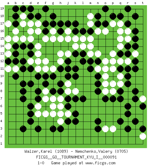 Last move : 1-0 2020 January 12 19:55:56 [Event "FICGS__GO__TOURNAMENT_KYU_I__000091"] [Site "FICGS"] [Date "2019.10.24"] [Round "1"] [Black "Walzer,Karel"] [White "Nemchenko,Valery"] [Result "1-0"] [Rating 1 "1089"] [Rating 2 "0705"] 1.d4 q16 2.q4 d16 3.k4 q10 4.k16 d10 5.o17 p17 6.f17 e16 7.f16 f15 8.d14 e14 9.d13 e13 10.d11 e11 11.c11 d12 12.c12 o16 13.n17 n16 14.m16 m15 15.l16 l15 16.k10 k15 17.h16 h15 18.q8 p9 19.e12 f12 20.e10 d12 21.d9 e12 22.f10 c10 23.b10 d15 24.c14 c15 25.b14 b15 26.j12 h12 27.h11 g11 28.g10 h10 29.j11 h13 30.h9 j13 31.k13 k14 32.l13 m14 33.n12 m13 34.m12 n13 35.q13 p13 36.q11 p11 37.r11 q12 38.r13 q14 39.r14 q15 40.s16 o12 41.n10 n11 42.m11 o11 43.n8 o10 44.n9 o9 45.r10 q9 46.r9 p8 47.p7 r12 48.s12 p12 49.o7 o8 50.r17 j16 51.j17 j15 52.h17 g16 53.g17 g15 54.d18 e17 55.e18 d17 56.b18 c17 57.b17 b16 58.p18 q17 59.q18 r18 60.s18 r16 61.r19 r15 62.s15 r8 63.q7 s13 64.s14 b11 65.c9 c18 66.c19 f18 67.g18 a17 68.b19 a18 69.d19 m17 70.k17 e19 71.f19 a14 72.b13 a13 73.a12 a15 74.s11 r7 75.r6 k12 76.k11 f11 77.c3 g5 78.g3 l14 79.l12 g6 80.j6 a11 81.b12 h5 82.j4 j5 83.k5 h4 84.h3 f5 85.d6 e5 86.d5 e6 87.e7 f7 88.e8 f8 89.j7 h6 90.h8 h7 91.g8 g7 92.e3 d7 93.c7 j8 94.k7 k8 95.l7 j9 96.j10 g9 97.f9 d8 98.c8 o18 99.n18 m18 100.o19 a19 101.a16 a17 102.r3 p3 103.n3 o3 104.n4 s6 105.r5 s5 106.s4 t4 107.t3 t5 108.s7 t7 109.s8 t2 110.t6 1-0 Here are the names of the openings (joseki) played in the four corners : Corner q16 : q16 o17 Hoshi (Hwajeom, Seongjeom, Xingwei`) 4-4 Point. The star or hoshi (4-4) point, emphasizing influence at the potential expense of territory. Ikken Kakari (Hankan Keolch'im, Yi Gua`jiao~, 1-Space Low Approach). Black 2 is the standard approach move to the 4-4. Corner d16 : d16 f17 Hoshi (Hwajeom, Seongjeom, Xingwei`) 4-4 Point. The star or hoshi (4-4) point, emphasizing influence at the potential expense of territory. Ikken Kakari (Hankan Keolch'im, Yi Gua`jiao~, 1-Space Low Approach). Black 2 is the standard approach move to the 4-4. Player Black won this Go (weiqi, baduk) game. Follow this game move after move (download)Keshi is worth as much as an invasion ! (Anonymous) Follow your passion, and success will follow you. (Arthur Buddhold)