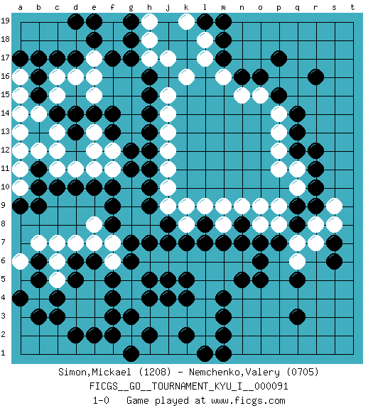 Last move : 1-0 2020 February 3 19:8:58 [Event "FICGS__GO__TOURNAMENT_KYU_I__000091"] [Site "FICGS"] [Date "2019.10.24"] [Round "1"] [Black "Simon,Mickael"] [White "Nemchenko,Valery"] [Result "1-0"] [Rating 1 "1208"] [Rating 2 "0705"] 1.r16 d4 2.q3 d16 3.f17 k16 4.p17 q10 5.f4 e5 6.f5 f6 7.g6 f7 8.g7 g8 9.c3 d3 10.c4 c5 11.b5 c6 12.b6 b7 13.d2 b4 14.b3 e4 15.f3 e3 16.e2 g5 17.e6 e7 18.d6 d7 19.d5 c7 20.d14 e15 21.c17 c16 22.d17 e16 23.d10 a6 24.a4 h6 25.h7 h8 26.j7 j6 27.j8 j9 28.l8 k9 29.l7 k8 30.k7 k6 31.h9 g9 32.h10 j10 33.h11 j11 34.h12 j12 35.h13 j13 36.h15 j14 37.h14 j15 38.h16 h17 39.g17 j17 40.q5 g10 41.g11 f11 42.f10 e11 43.e10 d11 44.c10 c11 45.b11 c12 46.e14 e17 47.e18 f18 48.d19 f19 49.g18 h18 50.g19 h19 51.e19 l9 52.n8 m9 53.q12 n9 54.o7 o9 55.q8 p9 56.q9 p11 57.r10 q11 58.r11 p12 59.q13 p13 60.q14 p14 61.p15 o15 62.o16 n15 63.n16 m16 64.m17 l17 65.m18 l18 66.l19 k19 67.m19 p8 68.p7 o8 69.n7 m8 70.m7 l6 71.k4 g4 72.g3 h3 73.h2 j3 74.m4 m6 75.n5 n6 76.o6 q7 77.o5 r7 78.r9 r8 79.h4 k3 80.j4 l3 81.m3 l4 82.h5 m5 83.k5 l5 84.m2 l2 85.l1 k1 86.m1 g2 87.g1 j2 88.f2 j1 89.j5 h1 90.k2 q6 91.s6 s8 92.s7 s9 93.r12 b12 94.b10 a11 95.f8 a10 96.a9 a12 97.b9 e8 98.f9 f12 99.f13 e13 100.d13 e12 101.f14 c13 102.c14 b14 103.b15 a15 104.b16 a16 105.a14 a13 106.a17 a14 107.g12 c15 108.b17 1-0 Here are the names of the openings (joseki) played in the four corners : Corner d16 : d16 f17 Hoshi (Hwajeom, Seongjeom, Xingwei`) 4-4 Point. The star or hoshi (4-4) point, emphasizing influence at the potential expense of territory. Ikken Kakari (Hankan Keolch'im, Yi Gua`jiao~, 1-Space Low Approach). Black 2 is the standard approach move to the 4-4. Corner d4 : d4 f4 Hoshi (Hwajeom, Seongjeom, Xingwei`) 4-4 Point. The star or hoshi (4-4) point, emphasizing influence at the potential expense of territory. Ikken Takagakari (Hankan Nop'dakeolch'im, Yi Gaojia, 1-Space High Approach). White typically responds at 6-4 or 3-10. White 4-10 is played when White finds play on the right side advantageous. White 4-8 or 3-8 may be played when White has support at top. Player Black won this Go (weiqi, baduk) game. Follow this game move after move (download)The game plays itself, the players don't control it. (Pierre Audouard) The modern world has divided itself into Conservatives and Progressives. The business of Progressives is to go on making mistakes. The business of the Conservatives is to prevent the mistakes from being corrected. (G.K. Chesterton)