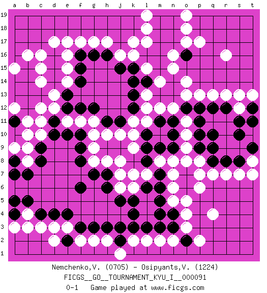 Last move : 0-1 2019 December 15 14:42:58 [Event "FICGS__GO__TOURNAMENT_KYU_I__000091"] [Site "FICGS"] [Date "2019.10.24"] [Round "1"] [Black "Nemchenko,Valery"] [White "Osipyants,Vladimir"] [Result "0-1"] [Rating 1 "0705"] [Rating 2 "1224"] 1.d4 q4 2.d16 r16 3.q10 p17 4.l16 f17 5.d10 c14 6.k4 c11 7.d11 c10 8.c9 d12 9.e12 d13 10.e13 e14 11.f14 e15 12.f15 e16 13.f16 g17 14.g16 c3 15.c4 d3 16.e4 e3 17.f3 f2 18.g3 e11 19.e10 f11 20.f12 g11 21.g12 g9 22.f10 g10 23.f9 g8 24.f8 k10 25.h11 h10 26.j11 j16 27.h16 h17 28.j15 k16 29.k15 j6 30.g7 j8 31.h7 j7 32.h6 o3 33.m4 q13 34.q12 o13 35.p12 p13 36.o12 r7 37.q9 p7 38.q8 q7 39.r8 n5 40.n4 o4 41.m5 n6 42.m6 n8 43.m7 m8 44.j5 k11 45.k12 l12 46.k13 l13 47.l14 n15 48.m15 n16 49.n14 o14 50.n13 n12 51.m13 m12 52.n11 m14 53.m16 o10 54.n10 o9 55.n9 o11 56.o8 p8 57.o7 n7 58.o6 p6 59.p11 r13 60.r12 s7 61.s8 t8 62.t9 t7 63.s10 b9 64.c8 b8 65.b7 b4 66.b5 b3 67.a4 a3 68.a5 g2 69.h3 h2 70.j2 m2 71.m3 l2 72.l3 k2 73.k3 j1 74.j3 l7 75.l6 k6 76.k5 l17 77.m17 l18 78.m18 k17 79.n17 o17 80.o16 o18 81.n18 o19 82.n19 s12 83.s11 s13 84.t12 t13 85.t11 j10 86.n3 n2 87.l8 k7 88.l9 k9 89.l10 l11 90.m11 h8 91.f6 b10 92.a8 a9 93.a7 l19 94.m19 l15 95.k14 pass 96.m9 o5 97.p9 o8 98.p10 pass 99.d15 d17 100.d14 e17 101.c13 c12 102.b13 c16 103.b14 c15 104.b15 b16 105.b12 a15 106.a14 b11 107.a11 a12 108.a13 a12 109.e2 d2 110.o2 p2 0-1 Here are the names of the openings (joseki) played in the four corners : Corner d16 : d16 f17 Hoshi (Hwajeom, Seongjeom, Xingwei`) 4-4 Point. The star or hoshi (4-4) point, emphasizing influence at the potential expense of territory. Ikken Kakari (Hankan Keolch'im, Yi Gua`jiao~, 1-Space Low Approach). White 2 is the standard approach move to the 4-4. Player White won this Go (weiqi, baduk) game. Follow this game move after move (download)On the second line six die, eight live. (Anonymous) The Movers & Shakers of this world are those who play chess in the mornings and go to the disco in the evenings. (Dinesh De Silva)