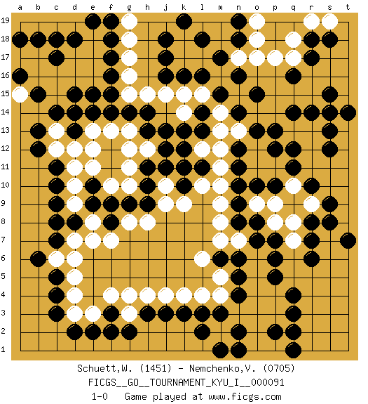Last move : 1-0 2020 May 6 6:48:32 [Event "FICGS__GO__TOURNAMENT_KYU_I__000091"] [Site "FICGS"] [Date "2019.10.24"] [Round "1"] [Black "Schuett,Wilhelm"] [White "Nemchenko,Valery"] [Result "1-0"] [Rating 1 "1451"] [Rating 2 "0705"] 1.q16 d4 2.q4 d16 3.f17 d10 4.c14 q10 5.e15 e16 6.f16 e17 7.k3 k4 8.m3 l4 9.l3 m4 10.r8 q8 11.r6 q7 12.r7 r9 13.r14 n3 14.n2 o3 15.h3 j4 16.j3 h4 17.f3 f4 18.d15 c16 19.k16 k15 20.l16 l15 21.n16 n15 22.p13 o12 23.o13 n13 24.h14 h15 25.j16 j15 26.g14 g15 27.f15 g16 28.c7 d7 29.c9 d9 30.c10 d11 31.c11 c12 32.c5 d5 33.c4 e3 34.f2 g3 35.g2 g4 36.d2 d3 37.e2 m2 38.l2 o2 39.m1 o1 40.d8 e8 41.c8 c6 42.b6 d6 43.q2 p3 44.q3 p4 45.p5 o5 46.p6 o6 47.p7 p8 48.o7 n7 49.o8 o9 50.n8 m8 51.n9 m9 52.o10 p9 53.n11 o11 54.p10 p11 55.n10 m11 56.n12 m12 57.q11 r11 58.q12 r12 59.s9 s10 60.s8 q13 61.p12 r13 62.q14 s14 63.s15 t13 64.s12 t9 65.s13 t12 66.t14 t11 67.n14 m13 68.m15 m14 69.o15 g17 70.f18 g18 71.b12 c13 72.b13 d14 73.d13 d12 74.e14 e12 75.j13 e13 76.k12 f13 77.f14 g13 78.l14 k14 79.l13 m10 80.h13 h12 81.k13 k11 82.d18 e18 83.e19 g19 84.f19 l17 85.j18 k17 86.j17 k18 87.m17 m18 88.k19 l19 89.l18 m19 90.c3 c15 91.c17 b17 92.b18 d17 93.c18 a17 94.b15 b16 95.a18 a15 96.a16 d14 97.p2 p1 98.q1 n17 99.n6 m7 100.n5 o4 101.n4 o17 102.n18 o18 103.n19 o19 104.r17 s11 105.s14 p17 106.n1 m5 107.m6 l6 108.d13 q17 109.r18 q18 110.d14 t8 111.t7 t10 112.r10 r19 113.s18 s19 114.l11 l12 115.j11 l10 116.h11 g12 117.j12 g11 118.k10 j10 119.l11 k9 120.h10 j9 121.g9 g10 122.h9 h8 123.f8 f7 124.e9 e7 125.e10 e11 126.k11 f10 127.f9 g8 128.pass 1-0 Here are the names of the openings (joseki) played in the four corners : Corner d16 : d16 f17 Hoshi (Hwajeom, Seongjeom, Xingwei`) 4-4 Point. The star or hoshi (4-4) point, emphasizing influence at the potential expense of territory. Ikken Kakari (Hankan Keolch'im, Yi Gua`jiao~, 1-Space Low Approach). Black 2 is the standard approach move to the 4-4. Corner d4 : d4 h3 Hoshi (Hwajeom, Seongjeom, Xingwei`) 4-4 Point. The star or hoshi (4-4) point, emphasizing influence at the potential expense of territory. Player Black won this Go (weiqi, baduk) game. Follow this game move after move (download)Always remember, keep the balance. [between territory and influence] (Figaro) I'm extremely disappointed. I send you out for exciting, new designer drugs, you come back with tomato sauce. (Gregory House, House M.D.)
