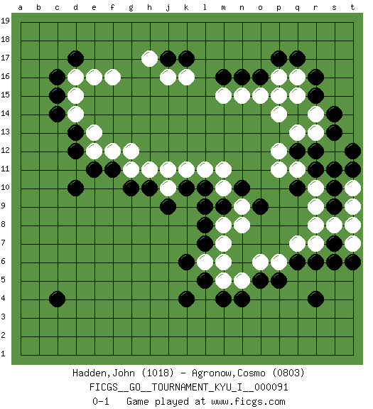 Last move : 0-1 2020 March 26 2:16:22 [Event "FICGS__GO__TOURNAMENT_KYU_I__000091"] [Site "FICGS"] [Date "2019.10.24"] [Round "1"] [Black "Hadden,John"] [White "Agronow,Cosmo"] [Result "0-1"] [Rating 1 "1018"] [Rating 2 "0803"] 1.c4 q16 2.r4 d16 3.k4 k16 4.r16 r14 5.q17 p16 6.p17 r7 7.r6 r10 8.c16 f16 9.c14 d14 10.d10 d15 11.c15 p6 12.p5 n5 13.n4 m5 14.d17 e16 15.k10 m10 16.l7 k11 17.h10 g12 18.f11 f12 19.d12 e13 20.d13 e12 21.e11 g11 22.g10 h11 23.k17 j16 24.j17 h17 25.m16 m15 26.n16 n15 27.o16 o15 28.r15 q15 29.s14 r13 30.s13 s12 31.l5 m7 32.m4 l6 33.k6 m6 34.l8 m8 35.l10 l11 36.m9 n9 37.l9 j10 38.j9 j11 39.o5 o6 40.q6 q7 41.s7 s8 42.s6 t7 43.t6 t8 44.q14 p15 45.r12 q13 46.q12 p14 47.s11 p12 48.r11 q11 49.s10 r9 50.s9 t9 51.t12 t10 52.t11 r8 53.q10 p11 54.n10 m11 55.o9 n8 0-1 Here are the names of the openings (joseki) played in the four corners : Corner q16 : q16 r16 Hoshi (Hwajeom, Seongjeom, Xingwei`) 4-4 Point. The star or hoshi (4-4) point, emphasizing influence at the potential expense of territory. Corner q4 : r4 r7 Komoku (Somok, Xiao~mu`) 3-4 Point. The komoku (3-4) point is the traditional corner enclosure move.. Corner d16 : d16 c16 Hoshi (Hwajeom, Seongjeom, Xingwei`) 4-4 Point. The star or hoshi (4-4) point, emphasizing influence at the potential expense of territory. Player White won this Go (weiqi, baduk) game. Follow this game move after move (download)Against three in a row, play right in the center. (Anonymous) Logic : The art of thinking and reasoning in strict accordance with the limitations and incapacities of the human misunderstanding. (Ambrose Bierce)