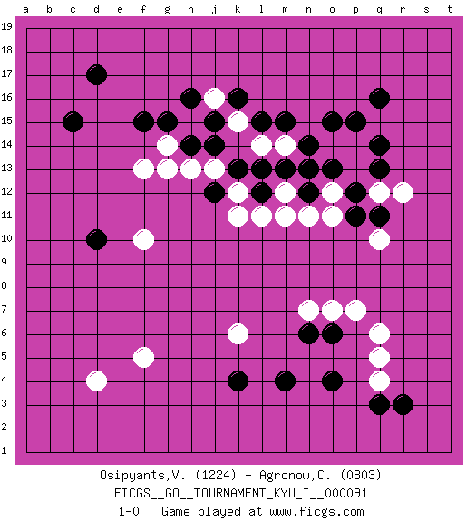 Last move : 1-0 2020 January 1 1:48:28 [Event "FICGS__GO__TOURNAMENT_KYU_I__000091"] [Site "FICGS"] [Date "2019.10.24"] [Round "1"] [Black "Osipyants,Vladimir"] [White "Agronow,Cosmo"] [Result "1-0"] [Rating 1 "1224"] [Rating 2 "0803"] 1.q16 d4 2.d17 q4 3.c15 p13 4.q14 q10 5.k4 k6 6.m4 p7 7.k16 f5 8.d10 f10 9.k13 k12 10.n6 n7 11.o6 o7 12.r3 q6 13.q3 q5 14.o4 f13 15.f15 j13 16.l13 m12 17.l12 l11 18.j12 k11 19.m13 h15 20.j14 h13 21.h14 g14 22.g15 g13 23.n12 m11 24.o15 o14 25.n14 k15 26.j15 l14 27.l15 j16 28.h16 m14 29.m15 n13 30.o13 p14 31.p15 o12 32.n13 n11 33.p12 o11 34.q13 q12 35.q11 r12 36.p11 1-0 This go game has been lost on time (started : 2019.10.24 11:7:21) Here are the names of the openings (joseki) played in the four corners : Corner q16 : q16 p13 Hoshi (Hwajeom, Seongjeom, Xingwei`) 4-4 Point. The star or hoshi (4-4) point, emphasizing influence at the potential expense of territory. Corner q4 : q4 m4 Hoshi (Hwajeom, Seongjeom, Xingwei`) 4-4 Point. The star or hoshi (4-4) point, emphasizing influence at the potential expense of territory. Player Black won this Go (weiqi, baduk) game. Follow this game move after move (download)Don't make territory near thickness. (Anonymous) The beginning of wisdom is silence. The second step is listening. (Unknown)