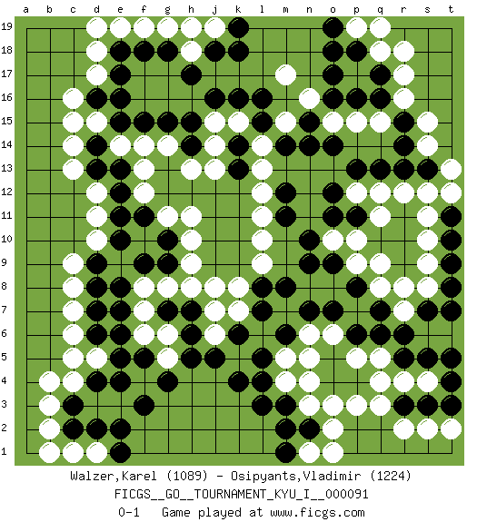 Last move : 0-1 2019 December 19 11:7:40 [Event "FICGS__GO__TOURNAMENT_KYU_I__000091"] [Site "FICGS"] [Date "2019.10.24"] [Round "1"] [Black "Walzer,Karel"] [White "Osipyants,Vladimir"] [Result "0-1"] [Rating 1 "1089"] [Rating 2 "1224"] 1.d4 q4 2.q16 c16 3.d16 d17 4.e16 c15 5.e17 d18 6.k16 o3 7.q6 q8 8.p4 p3 9.o4 q5 10.p6 q11 11.q13 r17 12.q17 r16 13.r15 s15 14.r14 s14 15.s13 q18 16.p18 r18 17.r5 r4 18.s5 r7 19.r6 p5 20.o5 o6 21.o7 n6 22.p8 n4 23.n7 q9 24.m6 n5 25.m8 d10 26.k4 c6 27.f3 c4 28.c3 b4 29.e8 c8 30.e6 h8 31.h7 j8 32.k6 j7 33.h6 g8 34.m3 j6 35.j5 h11 36.e13 h13 37.h15 c13 38.p11 p10 39.o11 r12 40.r13 s12 41.k13 j14 42.k14 j15 43.j16 l10 44.m12 p17 45.o18 q12 46.p13 p12 47.o12 q15 48.p16 p15 49.o16 o15 50.o14 n16 51.o17 m17 52.n15 m15 53.n14 k15 54.l15 l14 55.l16 l13 56.m14 l12 57.m11 l11 58.f11 f13 59.e12 f14 60.e10 d11 61.e11 g19 62.g18 f19 63.f18 h19 64.k18 h18 65.h17 d5 66.e4 b3 67.c2 b2 68.d7 c7 69.h14 j13 70.s7 s8 71.q7 r8 72.n2 o2 73.s3 s4 74.t4 s2 75.r3 r2 76.t10 t13 77.t8 s10 78.t11 s11 79.t9 s9 80.t7 t12 81.g10 h10 82.f9 g6 83.g7 f7 84.h5 f8 85.e7 f6 86.e5 g5 87.g4 q3 88.t3 t2 89.t5 o10 90.n9 n3 91.m2 k7 92.l7 m4 93.l4 c1 94.d2 d1 95.e1 b1 96.e2 d12 97.d9 c9 98.d14 c14 99.f15 e14 100.d13 g14 101.g15 f12 102.e18 e19 103.j18 l9 104.l8 k8 105.n10 d15 106.e15 g11 107.g9 h9 108.d8 n1 109.l3 m5 110.l5 j19 111.k19 d19 112.m1 o1 113.o9 p9 114.f5 p19 115.o19 q19 116.d6 c5 117.pass pass 0-1 Here are the names of the openings (joseki) played in the four corners : Corner d16 : c16 d16 Komoku (Somok, Xiao~mu`) 3-4 Point. The komoku (3-4) point is the traditional corner enclosure move.. Corner q16 : q16 q11 Hoshi (Hwajeom, Seongjeom, Xingwei`) 4-4 Point. The star or hoshi (4-4) point, emphasizing influence at the potential expense of territory. Corner d4 : d4 c6 Hoshi (Hwajeom, Seongjeom, Xingwei`) 4-4 Point. The star or hoshi (4-4) point, emphasizing influence at the potential expense of territory. Ikken Kakari (Hankan Keolch'im, Yi Gua`jiao~, 1-Space Low Approach). White 2 is the standard approach move to the 4-4. Player White won this Go (weiqi, baduk) game. Follow this game move after move (download)You can hide nothing on the goban. (Pierre Audouard) Life is like a ten-speed bicycle: most of us have gears we never use. (Charles M. Schulz)