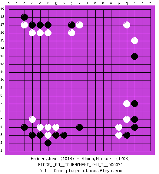 Last move : 0-1 2019 December 23 0:5:34 [Event "FICGS__GO__TOURNAMENT_KYU_I__000091 "] [Site "FICGS"] [Date "2019.10.24"] [Round "1"] [Black "Hadden,John "] [White "Simon,Mickael "] [Result "0-1"] [Rating 1 "1018"] [Rating 2 "1208"] 1.c4 q17 2.r4 d16 3.k4 r15 4.r13 e4 5.d3 d5 6.e3 g4 7.g3 f3 8.f2 f4 9.h3 p4 10.q3 q5 11.r5 q7 12.r7 p3 13.d17 e16 14.e17 f16 15.f17 c17 16.c18 k17 17.j17 j16 0-1 This go game has been lost on time (started : 2019.10.24 11:7:21) Here are the names of the openings (joseki) played in the four corners : Corner d4 : c4 e4Komoku (Somok, Xiao~mu`) 3-4 Point. The komoku (3-4) point is the traditional corner enclosure move..Ikken Takagakari (Hankan Nop'dakeolch'im, Yi Gaogua`jiao~, 1-Space High Approach). The 5-4 approach move has become more popular in modern times, as modern Go emphasizes speed and influence. Corner q4 : r4 p4Komoku (Somok, Xiao~mu`) 3-4 Point. The komoku (3-4) point is the traditional corner enclosure move..Ikken Takagakari (Hankan Nop'dakeolch'im, Yi Gaogua`jiao~, 1-Space High Approach). The 5-4 approach move has become more popular in modern times, as modern Go emphasizes speed and influence. Corner d16 : d16 d17Hoshi (Hwajeom, Seongjeom, Xingwei`) 4-4 Point. The star or hoshi (4-4) point, emphasizing influence at the potential expense of territory. Player White won this Go (weiqi, baduk) game.Follow this game move after move (download ) Eyes win semiais. (Anonymous) The human is the only animal species whose members are able to talk themselves into difficulties that would not otherwise exist. (Wendell Johnson)