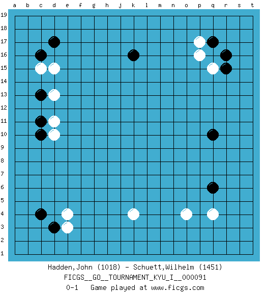 Last move : 0-1 2019 December 19 1:43:51 [Event "FICGS__GO__TOURNAMENT_KYU_I__000091 "] [Site "FICGS"] [Date "2019.10.24"] [Round "1"] [Black "Hadden,John "] [White "Schuett,Wilhelm "] [Result "0-1"] [Rating 1 "1018"] [Rating 2 "1451"] 1.c4 e3 2.d3 e4 3.d17 q4 4.r16 p17 5.q17 p16 6.q10 q15 7.r15 c15 8.c16 d15 9.k16 d10 10.c10 d11 11.c11 d13 12.c13 k4 13.q6 o4 0-1 Here are the names of the openings (joseki) played in the four corners : Corner d4 : c4 e3Komoku (Somok, Xiao~mu`) 3-4 Point. The komoku (3-4) point is the traditional corner enclosure move..Ikken Kakari (Hankan Keolch'im, Yi Gua`jiao~, 1-Space Low Pincer). The small knight move is the basic approach move to the 3-4 point stone. It has been continually used for over four centuries. There are limitless variations, with new moves constantly being discovered. White 2 opens the door to a treaure store of joseki. Corner q16 : r16 p17Komoku (Somok, Xiao~mu`) 3-4 Point. The komoku (3-4) point is the traditional corner enclosure move..Ikken Kakari (Hankan Keolch'im, Yi Gua`jiao~, 1-Space Low Pincer). The small knight move is the basic approach move to the 3-4 point stone. It has been continually used for over four centuries. There are limitless variations, with new moves constantly being discovered. White 2 opens the door to a treaure store of joseki. Corner d16 : d17 c15Komoku (Somok, Xiao~mu`) 3-4 Point. The komoku (3-4) point is the traditional corner enclosure move..Ikken Kakari (Hankan Keolch'im, Yi Gua`jiao~, 1-Space Low Pincer). The small knight move is the basic approach move to the 3-4 point stone. It has been continually used for over four centuries. There are limitless variations, with new moves constantly being discovered. White 2 opens the door to a treaure store of joseki. Corner q4 : q4 q6Hoshi (Hwajeom, Seongjeom, Xingwei`) 4-4 Point. The star or hoshi (4-4) point, emphasizing influence at the potential expense of territory.Ikken Takagakari (Hankan Nop'dakeolch'im, Yi Gaojia, 1-Space High Approach). White typically responds at 6-4 or 3-10. White 4-10 is played when White finds play on the right side advantageous. White 4-8 or 3-8 may be played when White has support at top. Player White won this Go (weiqi, baduk) game.Follow this game move after move (download ) The poor player plays the opponent's game for him. (Anonymous) No enterprise is more likely to succeed than one concealed from the enemy until it is ripe for execution. (Niccolo Machiavelli)