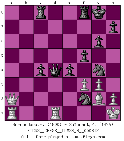 Last move : 0-1 2020 January 20 11:40:10 [Event "FICGS__CHESS__CLASS_B__000312"] [Site "FICGS"] [Date "2019.10.28"] [Round "1"] [White "Bernardara,Enos"] [Black "Satonnet,Patrick"] [Result "0-1"] [WhiteElo "1800"] [BlackElo "1896"] 1.c4 f5 2.e3 Nf6 3.Nc3 g6 4.d4 Bg7 5.g3 O-O 6.Bg2 d6 7.Nf3 e5 8.O-O e4 9.Nd2 c6 10.b4 a6 11.Bb2 Be6 12.c5 a5 13.a3 axb4 14.axb4 Na6 15.b5 cxb5 16.Nxb5 dxc5 17.Na3 Rc8 18.Qa4 Nb4 19.Ndc4 Nd3 20.Qc2 cxd4 21.Bxd4 Bxc4 22.Nxc4 b5 23.Qa2 bxc4 24.Rfd1 Ng4 25.f3 Bxd4 26.exd4 Qxd4+ 27.Kh1 Ndf2+ 0-1 English : Anglo-Dutch defense Kingside Castling by player Black (move 5) Kingside Castling by player White (move 8) Player Black won this chess game. Follow this game move after move (download)The chessboard is the world, the pieces are the phenomena of the Universe, the rules of the game are what we call the laws of Nature and the player on the other side is hidden from us. (Thomas Huxley) Wenn Dein Gegner dir ein Remis anbietet, versuch herauszufinden, weshalb er glaubt schlechter zu stehen. (Nigel Short) Los errores estan ahí, esperando a que se cometan. (Savielly Tartakower) Il vaut mieux sacrifier les pièces de l'adversaire. (Xavier Tartacover) The meaning of life is that it is to be lived, and it is not to be traded and conceptualized and squeezed into a pattern of systems. (Bruce Lee)