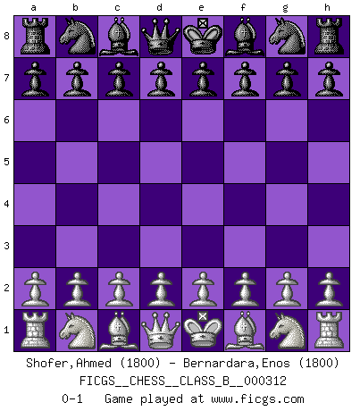 Last move : 0-1 2019 December 7 11:56:4 [Event "FICGS__CHESS__CLASS_B__000312"] [Site "FICGS"] [Date "2019.10.28"] [Round "1"] [White "Shofer,Ahmed"] [Black "Bernardara,Enos"] [Result "0-1"] [WhiteElo "1800"] [BlackElo "1800"] 0-1 This chess game has been lost on time (started : 2019.10.28 11:15:48) Player Black won this chess game. Follow this game move after move (download)The isolated Pawn casts gloom over the entire chessboard. (Aaron Nimzovich) Ich verstehe Aljechins Kombinationen ganz gut; aber woher er diese Angriffschancen bekommt und wie er die Eröffnung behandelt das ist für mich ein Buch mit sieben Siegeln. (Rudolf Spielmann) Evita las multitudes. Haz independientemente tu propio razonamiento. Trata de ser el jugador de Ajedrez, no la pieza de Ajedrez. (Ralph Charell) Les écrivains ont utilisé les échecs pour analyser les côtés extrêmes de la nature humaine. Dans ce cadre, les échecs offrent un champ d'expérimentation idéal. Mais on pourrait faire la même chose avec la peinture. Et là, en vous référant à Van Gogh, vous ne tirerez pas de conclusion définitive sur les peintres. (Gary Kasparov) Thibault, I ask for draw. Game 13876. - Sorry Ilmars, you won. (FICGS chat)