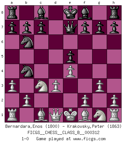 Last move : 1-0 2019 December 31 9:52:37 [Event "FICGS__CHESS__CLASS_B__000312"] [Site "FICGS"] [Date "2019.10.28"] [Round "1"] [White "Bernardara,Enos"] [Black "Krakovsky,Peter"] [Result "1-0"] [WhiteElo "1800"] [BlackElo "1863"] 1.c4 e5 2.Nc3 Nf6 3.g3 d5 4.cxd5 Nxd5 5.Bg2 Nb6 6.e4 Nc6 7.d3 Nb4 8.Bf1 Qe7 9.a3 1-0 This chess game has been lost on time (started : 2019.10.28 11:15:48) English : Bremen, reverse Dragon Player White won this chess game. Follow this game move after move (download)First-class players lose to second class players because second-class players sometimes play a first-class game. (Tarrasch) Die FIDE ist dabei in die Hände der russischen Mafia zu fallen. (Larry Evans) No existe un remordimiento como el remordimiento del Ajedrez. (H. G. Wells) Les ravages du H expliquent la différence de niveau entre Tal et Thal [Abergel]. I teach you to lie, cheat and steal, and as soon as my back's turned you wait in line ? (Gregory House, House M.D.)