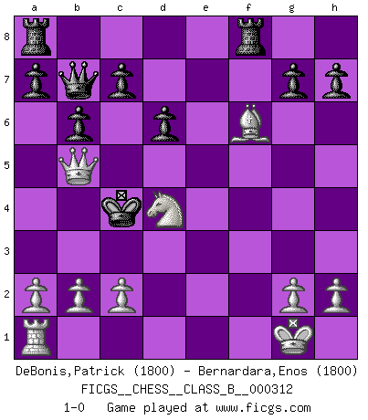 Last move : 1-0 2020 January 8 5:50:53 [Event "FICGS__CHESS__CLASS_B__000312"] [Site "FICGS"] [Date "2019.10.28"] [Round "1"] [White "DeBonis,Patrick"] [Black "Bernardara,Enos"] [Result "1-0"] [WhiteElo "1800"] [BlackElo "1800"] 1.e4 Nc6 2.d4 d6 3.d5 Ne5 4.f4 Ng6 5.Nc3 e6 6.dxe6 fxe6 7.Nf3 b6 8.f5 exf5 9.Bb5+ Bd7 10.exf5 N6e7 11.Nd4 Nf6 12.Ne6 Qc8 13.Bg5 Nxf5 14.O-O Bxb5 15.Nxb5 Qb7 16.Bxf6 Ne3 17.Qh5+ Kd7 18.Nxf8+ Rhxf8 19.Qh3+ Kc6 20.Nd4+ Kd5 21.Rf5+ Nxf5 22.Qxf5+ Kc4 23.Qb5+ 1-0 KP : Nimzovich defense Kingside Castling by player White (move 14) Player White won this chess game. Follow this game move after move (download)Fischer Chess play was always razor-sharp, rational and brilliant. One of the best ever. (Dave Regis) Mit Schach schule ich mein Gefühl für Geometrie, was für Tennis und Schach gleichermaßen wichtig ist. (Boris Becker) Un mal plan es mejor que no tener ningún plan. (Frank Marshall) L'attaque fait le spectacle, la défense gagne les matchs. (Dicton footballistique) Lottery : A tax on people who are bad at math. (Author unknown)