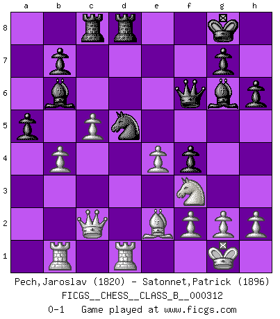 Last move : 0-1 2020 May 21 6:32:21 [Event "FICGS__CHESS__CLASS_B__000312"] [Site "FICGS"] [Date "2019.10.28"] [Round "1"] [White "Pech,Jaroslav"] [Black "Satonnet,Patrick"] [Result "0-1"] [WhiteElo "1820"] [BlackElo "1896"] 1.d4 f5 2.Nf3 Nf6 3.c4 e6 4.Nc3 Bb4 5.Qb3 c5 6.Bg5 O-O 7.e3 h6 8.Bxf6 Qxf6 9.Be2 Nc6 10.Rd1 d6 11.O-O Rd8 12.Qc2 Ba5 13.a3 Bd7 14.d5 Ne7 15.dxe6 Bxe6 16.Nb5 Bf7 17.Rb1 Bg6 18.b4 Bb6 19.Nc3 Rac8 20.Rfd1 f4 21.e4 cxb4 22.axb4 d5 23.c5 a5 24.Nxd5 Nxd5 0-1 This chess game has been lost on time (started : 2019.10.28 11:15:48) Dutch Kingside Castling by player Black (move 6) Kingside Castling by player White (move 11) Player Black won this chess game. Follow this game move after move (download)What is the object of playing a gambit opening?... To acquire a reputation of being a dashing player at the cost of losing a game. (Siegbert Tarrasch) Stil? Ich habe keinen Stil! (Anatoly Karpov) El Ajedrez tiene tanto misterio como las mujeres. (Purdy) La tactique est l'élément le plus important du milieu de jeu. (Siegbert Tarrasch) We need strong personalities and only one world champion to attract sponsors. (Anatoly Karpov)