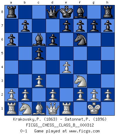 Last move : 0-1 2019 December 24 6:12:34 [Event "FICGS__CHESS__CLASS_B__000312"] [Site "FICGS"] [Date "2019.10.28"] [Round "1"] [White "Krakovsky,Peter"] [Black "Satonnet,Patrick"] [Result "0-1"] [WhiteElo "1863"] [BlackElo "1896"] 1.e4 c5 2.Nf3 Nc6 3.Bb5 d6 4.O-O Bd7 5.Re1 Nf6 6.c3 a6 7.Bxc6 Bxc6 0-1 This chess game has been lost on time (started : 2019.10.28 11:15:48) Sicilian : Nimzovich-Rossolimo attack (without ...d6) Kingside Castling by player White (move 4) Player Black won this chess game. Follow this game move after move (download)Checkers is for tramps. (Paul Morphy) Ein typischer, sehr verbreiteter Gedankenschädling ist der, daß der betreffende Amateur von der Annanhme ausgeht, daß jeder einzelne Zug etwas zu leisten habe. (Aaron Nimzowitsch) Desconfianza es la característica mas necesaria de un jugador de Ajedrez. (Siegbert Tarrasch) La solitude du joueur d'Echecs à l'approche du mat est semblable à celle du condamné. (Francis Szpiner) Now the reason the enlightened prince and the wise general conquer the enemy whenever they move and their achievements surpass those of ordinary men is foreknowledge. (Sun Tzu)