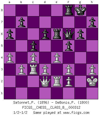 Last move : 1/2-1/2 2020 January 8 17:4:31 [Event "FICGS__CHESS__CLASS_B__000312"] [Site "FICGS"] [Date "2019.10.28"] [Round "1"] [White "Satonnet,Patrick"] [Black "DeBonis,Patrick"] [Result "1/2-1/2"] [WhiteElo "1896"] [BlackElo "1800"] 1.e4 c5 2.Nf3 d6 3.Bb5+ Bd7 4.Bxd7+ Nxd7 5.O-O Ngf6 6.Qe2 a6 7.b3 g6 8.c4 Bg7 9.Bb2 e5 10.d3 Nf8 11.a4 Ne6 12.Bc1 O-O 13.Nc3 Nh5 14.Qd1 f5 15.Nd5 Nf6 16.Bg5 Nxg5 17.Nxg5 Re8 18.Nc3 Nh5 19.Nh3 Nf4 20.Nxf4 exf4 21.Rc1 Bxc3 22.Rxc3 Qf6 23.Qd2 Rad8 24.h3 f3 25.gxf3 Re6 26.Re1 Rf8 27.Kh2 Qd4 28.Re2 Qf6 29.Re1 Qd4 30.Re2 Qf6 1/2-1/2 Sicilian : Canal-Sokolsky attack, 3...Bd7 Kingside Castling by player White (move 5) Kingside Castling by player Black (move 12) This chess game ended in a draw. Follow this game move after move (download)Chess is a cold bath for the mind. (Sir John Simon) Der vorletzte Fehler gewinnt. (Savielly Grigorievitsch Tartakower) Haz el enroque temprano y seguido. (Rob Sillars) Le temps de noter son nom sur la feuille de partie, j'étais déjà en zeitnot ! D'un modeste amateur apparié lors de la première ronde d'un open contre le grand-maître Azmaïparashvili. Hardware: the parts of a computer that can be kicked. (Jeff Persis)