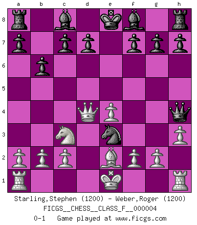 Last move : 0-1 2006 September 2 19:14:28 [Event "FICGS__CHESS__CLASS_F__000004"] [Site "FICGS"] [Date "2006.06.18"] [Round "1"] [White "Starling,Stephen"] [Black "Weber,Roger"] [Result "0-1"] [WhiteElo "1200"] [BlackElo "1200"] 1.e4 e5 2.Nf3 Nc6 3.d4 exd4 4.Nxd4 Qh4 5.Nc3 Nxd4 6.Qxd4 Nf6 7.Be3 Ng4 8.h3 b6 9.Be2 Nxe3 0-1 This chess game has been lost on time (started : 2006.06.18 21:18:40) Scotch : Steinitz variation Player Black won this chess game. Follow this game move after move (download)Chess is played with the mind and not with the hands ! (Renaud and Kahn) Das Blackmar-Diemer-Gambit verändert den ganzen Menschen! (Emil Joseph Diemer) Yo considero que Fischer es uno de los expertos mas grandes de aperturas de siempre. (Keith Hayward) Les écrivains ont utilisé les échecs pour analyser les côtés extrêmes de la nature humaine. Dans ce cadre, les échecs offrent un champ d'expérimentation idéal. Mais on pourrait faire la même chose avec la peinture. Et là, en vous référant à Van Gogh, vous ne tirerez pas de conclusion définitive sur les peintres. (Gary Kasparov) Your best chance to get a Royal Flush in a casino is in the bathroom. (Anonymous)