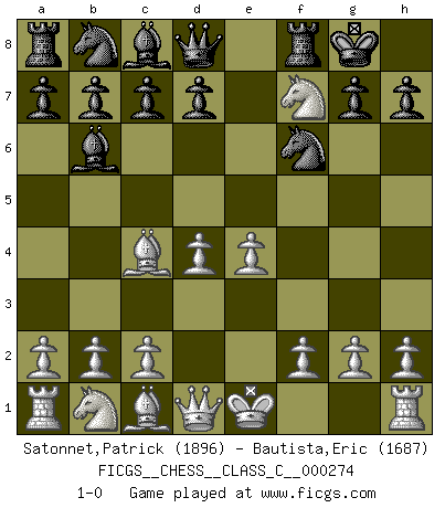 Last move : 1-0 2019 December 18 22:40:11 [Event "FICGS__CHESS__CLASS_C__000274"] [Site "FICGS"] [Date "2019.10.28"] [Round "1"] [White "Satonnet,Patrick"] [Black "Bautista,Eric"] [Result "1-0"] [WhiteElo "1896"] [BlackElo "1687"] 1.e4 e5 2.Nf3 Nf6 3.Nxe5 Bc5 4.d4 Bb6 5.Bc4 O-O 6.Nxf7 1-0 This chess game has been lost on time (started : 2019.10.28 11:16:19) Petrov's defense Kingside Castling by player Black (move 5) Player White won this chess game. Follow this game move after move (download)Not only will I predict his triumph over Botvinnik, but I'll go further and say that he'll probably be the greatest Chess player that ever lived. (John Collins) Wer der Ansicht ist, daß alle Schachspieler verrückt sind, wird durch Studium des Lebens von Emil Josef Diemer nicht auf andere Gedanken kommen. (Hans Ree) Un buen sacrificio es aquel que aunque no sea necesariamente sólido, deja a tu oponente aturdido y confuso. (Rudolph Spielmann) Même si vous avez un bon coup à faire, regardez toujours s'il n'y en a pas un qui lui soit préférable. (Pedro Damiano) Success without honor is an unseasoned dish; it will satisfy your hunger, but it won't taste good. (Joe Paterno)