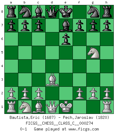 Last move : 0-1 2019 December 31 9:52:37 [Event "FICGS__CHESS__CLASS_C__000274"] [Site "FICGS"] [Date "2019.10.28"] [Round "1"] [White "Bautista,Eric"] [Black "Pech,Jaroslav"] [Result "0-1"] [WhiteElo "1687"] [BlackElo "1820"] 1.e4 e6 2.Nf3 d5 3.d3 dxe4 4.Ng5 exd3 5.Bxd3 Be7 0-1 This chess game has been lost on time (started : 2019.10.28 11:16:19) French defense Player Black won this chess game. Follow this game move after move (download)Dazzling combinations are for the many, shifting wood is for the few. (Georg Kieninger) Schach ist das Spiel, das die Verrückten gesund hält. (Albert Einstein) Mi estilo es algo parecido entre un poco de Tal y Petrosian. (Reshevsky) Le plus grand jeu de l'esprit jamais inventé, plus vous l'apprenez, plus vous y prenez du plaisir. (Garry Kasparov) Wisdom doesn't necessarily come with age. Sometimes age just shows up all by itself. (Tom Watson)