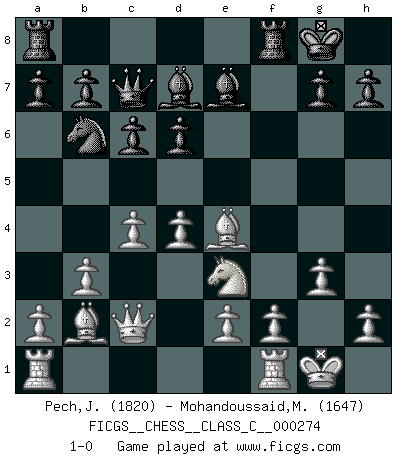 Last move : 1-0 2020 April 11 16:30:51 [Event "FICGS__CHESS__CLASS_C__000274"] [Site "FICGS"] [Date "2019.10.28"] [Round "1"] [White "Pech,Jaroslav"] [Black "Mohandoussaid,Malik"] [Result "1-0"] [WhiteElo "1820"] [BlackElo "1647"] 1.c4 f5 2.d4 Nf6 3.g3 e6 4.Bg2 Be7 5.Nf3 O-O 6.O-O d6 7.Nc3 Nbd7 8.Qc2 c6 9.b3 Qc7 10.Bb2 e5 11.Qxf5 Nb6 12.Qc2 Bg4 13.Nd1 e4 14.Ng5 Bf5 15.Ne3 Bd7 16.Nxe4 Nxe4 17.Bxe4 1-0 This chess game has been lost on time (started : 2019.10.28 11:16:19) English : Anglo-Dutch defense Kingside Castling by player Black (move 5) Kingside Castling by player White (move 6) Player White won this chess game. Follow this game move after move (download)Chess is no whit inferior to the violin, and we have a large number of professional violinists. (Mikhail Botvinnik) Gewöhnliche Menschen denken nur daran, wie sie ihre Zeit verbringen. Ein intelligenter Mensch versucht, sie auszunutzen. (Arthur Schopenhauer) No es suficiente ser un buen jugador, se debe también de jugar bién. (Siegbert Tarrasch) Celui qui prend des risques peut perdre, celui qui n'en prend pas perd toujours. (Xavier Tartacover) You must have a dream in order to have it come true. (A.P.J. Kalam)
