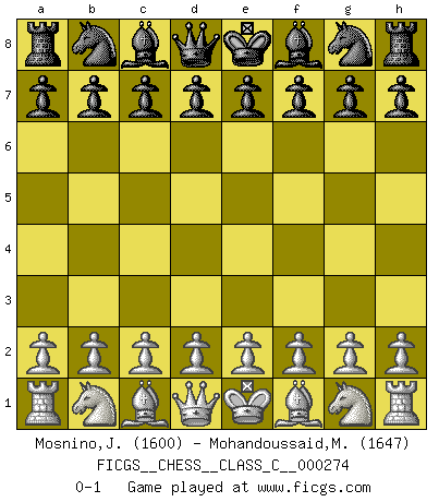Last move : 0-1 2019 December 7 11:56:4 [Event "FICGS__CHESS__CLASS_C__000274"] [Site "FICGS"] [Date "2019.10.28"] [Round "1"] [White "Mosnino,Jean-Francois"] [Black "Mohandoussaid,Malik"] [Result "0-1"] [WhiteElo "1600"] [BlackElo "1647"] 0-1 This chess game has been lost on time (started : 2019.10.28 11:16:19) Player Black won this chess game. Follow this game move after move (download)A sacrifice is best refuted by accepting it. (Wilhelm Steinitz) Modernes Schach sorgt sich zuviel um Dinge wie Bauernstruktur usw. Vergessen Sie das, Schachmatt beendet das Spiel! (Nigel Short) Al jugar al Ajedrez entonces, podemos aprender: Primero: Previsión... Segundo: Prudencia... Tercero: Cautela... Y al final, aprendemos del Ajedrez el hábito de no ser desanimados por apariencias malas presentes en el estado de nuestros asuntos, el hábito de la esperanza por una oportunidad favorable y la perseveración de los secretos de los recursos. (Benjamin Franklin) Il vaut toujours mieux jouer un plan faux de façon logique que de n'avoir pas de plan du tout. (Victor Kortchnoï) Humor is by far the most significant activity of the human brain. (Edward De Bono)