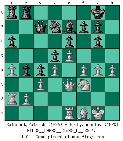 Last move : 1-0 2020 May 22 17:7:17 [Event "FICGS__CHESS__CLASS_C__000274"] [Site "FICGS"] [Date "2019.10.28"] [Round "1"] [White "Satonnet,Patrick"] [Black "Pech,Jaroslav"] [Result "1-0"] [WhiteElo "1896"] [BlackElo "1820"] 1.e4 c5 2.Nf3 Nc6 3.Bb5 d6 4.O-O Bd7 5.Re1 Nf6 6.c3 a6 7.Bf1 Bg4 8.d3 e6 9.Nbd2 Be7 10.h3 Bh5 11.g4 Bg6 12.a4 d5 13.Nh4 O-O 14.Nxg6 hxg6 15.Qe2 Qc7 16.e5 Nd7 17.f4 b5 18.Nf3 b4 19.h4 Na5 20.Qd1 c4 21.d4 Nb3 22.Ra2 Nxc1 23.Qxc1 Rfb8 24.Qe3 1-0 This chess game has been lost on time (started : 2019.10.28 11:16:19) Sicilian : Nimzovich-Rossolimo attack (without ...d6) Kingside Castling by player White (move 4) Kingside Castling by player Black (move 13) Player White won this chess game. Follow this game move after move (download)If your opponent offers you a draw, try to work out why he thinks he's worse off. (Nigel Short) Ich bin es gewohnt, das die Jugend mir überhaupt keinen Respekt entgegenbringt. (Alexander Morozewich) La estratégia requiere pensar, la táctica requiere observación. (Max Euwe) Les échecs, c'est l'imagination. (David Bronstein) All politicians must be presumed guilty until they are proven innocent. (Dinesh De Silva)