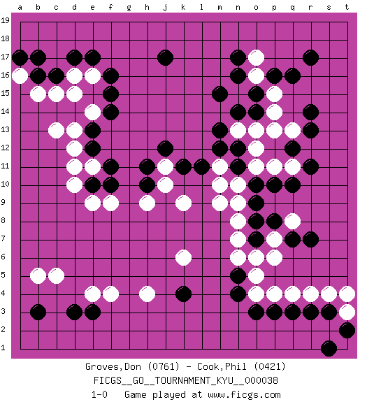 Last move : 1-0 2007 October 17 22:24:15 [Event "FICGS__GO__TOURNAMENT_KYU__000038"] [Site "FICGS"] [Date "2007.06.27"] [Round "1"] [Black "Groves,Don"] [White "Cook,Phil"] [Result "1-0"] [Rating 1 "0761"] [Rating 2 "0421"] 1.q16 q4 2.c16 c5 3.j17 c13 4.q10 q8 5.k4 e16 6.e17 d16 7.d17 c15 8.b16 b15 9.f16 d15 10.f15 h4 11.o3 o4 12.n4 o5 13.p3 p4 14.q3 r4 15.r3 s4 16.r13 k6 17.n16 n6 18.d3 e4 19.b3 b5 20.e3 f4 21.o9 m9 22.o7 n7 23.e13 d12 24.e12 d10 25.n11 m11 26.m12 n10 27.l11 m10 28.k11 k9 29.h10 h9 30.f10 f9 31.e10 e9 32.r17 o11 33.n12 o12 34.o10 n9 35.q7 p7 36.p8 p6 37.r7 n8 38.o8 p13 39.q12 q13 40.r14 n13 41.m13 n15 42.n14 o13 43.o14 p11 44.p10 j10 45.h11 j11 46.j12 e14 47.f14 q11 48.r11 p14 49.o15 p15 50.p16 o17 51.n17 o16 52.m15 a16 53.b17 d11 54.a17 e11 55.f11 d13 56.n5 o6 57.s3 t3 58.t2 t4 59.s1 1-0 Here are the names of the openings (joseki) played in the four corners : Player Black won this Go (weiqi, baduk) game. Follow this game move after move (download)With less than 15 stones in danger, tenuki. (Anonymous) Either move or be moved. (Ezra Pound)