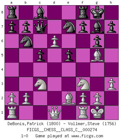 Last move : 1-0 2019 November 3 11:33:37 [Event "FICGS__CHESS__CLASS_C__000274"] [Site "FICGS"] [Date "2019.10.28"] [Round "1"] [White "DeBonis,Patrick"] [Black "Vollmer,Steve"] [Result "1-0"] [WhiteElo "1800"] [BlackElo "1756"] 1.e4 Nf6 2.e5 Nd5 3.d4 d6 4.Nf3 g6 5.c4 Nb6 6.Nc3 Bg7 7.exd6 cxd6 8.h3 O-O 9.Be2 Nc6 10.O-O Qc7 11.Bg5 e5 12.d5 Ne7 13.c5 dxc5 14.d6 1-0 Alekhine's defense : Modern, Fianchetto variation Kingside Castling by player Black (move 8) Kingside Castling by player White (move 10) Player White won this chess game. Follow this game move after move (download)Chess is war over the board. The object is to crush the opponents mind. (Bobby Fischer) Rubinstein ist ein Turmendspiel, welches die Götter vor tausenden von Jahren begannen. (Savielly Grigorievitsch Tartakower) El Ajedrez es el juego mas altamente simbólico, pero las agresiones estan por lo tanto aún mas francamente representadas en la partida. Tal vez comenzo como un juego de guerra; Algo como la representación de una batalla en miniatura entre las fuerzas de dos reinos. (Karl Meninger) Le jeu d'échecs est comme rejeté hors du temps. (Antoine de Saint-Exupéry) If you lose the game you should win the analysis! (Proverb)