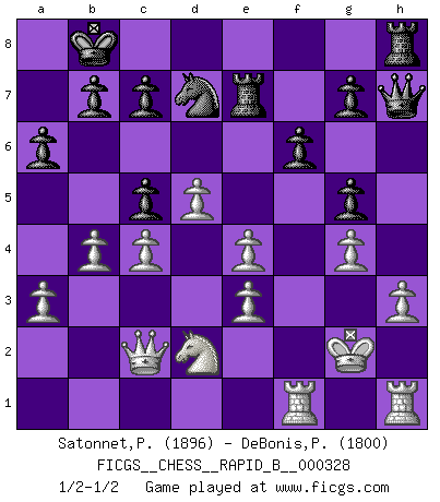 Last move : 1/2-1/2 2019 December 30 12:55:12 [Event "FICGS__CHESS__RAPID_B__000328"] [Site "FICGS"] [Date "2019.10.28"] [Round "1"] [White "Satonnet,Patrick"] [Black "DeBonis,Patrick"] [Result "1/2-1/2"] [WhiteElo "1896"] [BlackElo "1800"] 1.e4 e5 2.Nf3 Nc6 3.Bb5 a6 4.Bxc6 dxc6 5.O-O Bg4 6.h3 Bh5 7.g4 Bg6 8.Nxe5 Qh4 9.Qf3 f6 10.Nxg6 hxg6 11.Kg2 g5 12.d4 O-O-O 13.Be3 Bd6 14.Nd2 Ne7 15.Rh1 Qh7 16.Rad1 Kb8 17.c4 Ng6 18.Qe2 Bf4 19.Qd3 c5 20.d5 Rde8 21.b4 Bxe3 22.fxe3 Ne5 23.Qb3 Nd7 24.Qc2 Re5 25.a3 Re7 26.Rb1 Rd8 27.Rbf1 Rh8 1/2-1/2 Ruy Lopez : Exchange variation, 5.O-O Kingside Castling by player White (move 5) Queenside Castling by player Black (move 12) This chess game ended in a draw. Follow this game move after move (download)If Chess is a science, it's a most inexact one. If Chess is an art, it is too exacting to be seen as one. If Chess is a sport, it's too esoteric. If Chess is a game, it's too demanding to be just a game. If Chess is a mistress, she's a demanding one. If Chess is a passion, it's a rewarding one. If Chess is life, it's a sad one. (Unknown) Du musst Deinen Gegner in einen tiefen dunklen Wald führen wo 2+2=5 ist und wo der Weg, der wieder hinausführt, nur breit genug für einen ist. (Mikhail Nekhemyevich Tal) El Ajedrez se juega con la mente... ¡no con las manos!. (Renaud y Kahn) La vie et les Echecs sont tous les deux une lutte constante. (Lasker) The Internet isn't free. It just has an economy that makes no sense to capitalism. (Brad Shapcott)