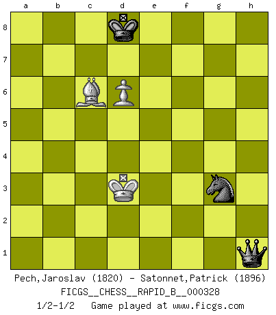 Last move : 1/2-1/2 2020 May 16 20:41:31 [Event "FICGS__CHESS__RAPID_B__000328"] [Site "FICGS"] [Date "2019.10.28"] [Round "1"] [White "Pech,Jaroslav"] [Black "Satonnet,Patrick"] [Result "1/2-1/2"] [WhiteElo "1820"] [BlackElo "1896"] 1.e4 c5 2.Nf3 Nc6 3.d4 cxd4 4.Nxd4 Nf6 5.Nc3 e5 6.Ndb5 d6 7.Bg5 a6 8.Na3 b5 9.Bxf6 gxf6 10.Nd5 f5 11.Bd3 Be6 12.O-O Bxd5 13.exd5 Ne7 14.c3 Bg7 15.Qh5 e4 16.Be2 O-O 17.Nc2 f4 18.Qg5 f5 19.Rfd1 f3 20.gxf3 Kh8 21.Kh1 Rg8 22.Qe3 exf3 23.Bxf3 Ng6 24.Nd4 Bxd4 25.Qxd4+ Ne5 26.Be2 Qf6 27.f3 Qg7 28.Qf2 Qh6 29.a4 bxa4 30.Rxa4 Rab8 31.Rh4 Qf6 32.Rb4 a5 33.Rxb8 Rxb8 34.Rb1 Ng6 35.Qa7 Rg8 36.Qe3 Qg7 37.Bf1 f4 38.Qf2 Ne5 39.Bh3 Qg6 40.Rd1 Rg7 41.Bf1 Qg5 42.Bd3 Qh5 43.Be2 Qf5 44.Bb5 Rg8 45.b3 Qc8 46.c4 Qb7 47.Ba4 Qg7 48.Rg1 Qxg1+ 49.Qxg1 Rxg1+ 50.Kxg1 Kg7 51.Kf2 Kf6 52.Ke2 Ke7 53.h3 h6 54.Kd2 Nxf3+ 55.Kd3 h5 56.c5 dxc5 57.Ke4 Ng5+ 58.Kxf4 Nxh3+ 59.Ke5 h4 60.d6+ Kd8 61.Kd5 Nf4+ 62.Kxc5 h3 63.Bc6 Ne2 64.b4 axb4 65.Kxb4 h2 66.Kc4 Ng3 67.Kd3 h1Q 1/2-1/2 Sicilian : Pelikan (Lasker/Sveshnikov) variation Kingside Castling by player White (move 12) Kingside Castling by player Black (move 16) 10 pieces endgame at move 58 : White KBPPP , Black KNPPP WHITE : King + 1 Bishop 3 Pawns BLACK : King + 1 Knight 3 Pawns 9 pieces endgame at move 58 : White KBPP , Black KNPPP WHITE : King + 1 Bishop 2 Pawns BLACK : King + 1 Knight 3 Pawns 8 pieces endgame at move 62 : White KBPP , Black KNPP WHITE : King + 1 Bishop 2 Pawns BLACK : King + 1 Knight 2 Pawns 7 pieces endgame at move 64 : White KBP , Black KNPP WHITE : King + 1 Bishop 1 Pawn BLACK : King + 1 Knight 2 Pawns 6 pieces endgame at move 65 : White KBP , Black KNP WHITE : King + 1 Bishop 1 Pawn BLACK : King + 1 Knight 1 Pawn Promotion Queen by player Black (move 67) This chess game ended in a draw. Follow this game move after move (download)Human affairs are like a Chess game: only those who do not take it seriously can be called good players. (Hung Tzu Ch'eng) Kombinieren und Schwarzhandel gehören verboten. (Savielly Grigorievitsch Tartakower) Dejen al perfeccionista jugar por correo. (Yasser Seirawan) Le profane ne songe pas à la somme de jouissance dont il se prive, qui méconnaît ce jeu aux ressources aussi variées que passionnantes. (Jean-Marie Jeanton-Lamarche) Never was anything great achieved without danger. (Niccolo Machiavelli)