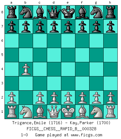 Last move : 1-0 2019 November 28 11:23:51 [Event "FICGS__CHESS__RAPID_B__000328"] [Site "FICGS"] [Date "2019.10.28"] [Round "1"] [White "Trigance,Emile"] [Black "Kay,Parker"] [Result "1-0"] [WhiteElo "1716"] [BlackElo "1700"] 1.b4 1-0 This chess game has been lost on time (started : 2019.10.28 13:47:41) Polish (Sokolsky) opening Player White won this chess game. Follow this game move after move (download)Whoever sees no other aim in the game than that of giving checkmate to one's opponent will never become a good Chess player. (Euwe) Im Leben werden Partien nie so unstrittig gewonnen wie im Spiel (Emanuel Lasker) Las ideas audaces son como las piezas del Ajedrez que avanzan hacia adelante. Ellas pueden ser vencidas, pero también pueden iniciar una partida victoriosa. (Goethe) Le système Elo représente seulement une moyenne. Il est simplement un indicateur de votre stabilité. (Anatoli Karpov) Life is the sum of all your choices. (Albert Camus)