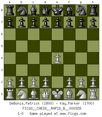 Last move : 1-0 2019 November 28 11:23:51 [Event "FICGS__CHESS__RAPID_B__000328"] [Site "FICGS"] [Date "2019.10.28"] [Round "1"] [White "DeBonis,Patrick"] [Black "Kay,Parker"] [Result "1-0"] [WhiteElo "1800"] [BlackElo "1700"] 1.e4 1-0 This chess game has been lost on time (started : 2019.10.28 13:47:41) King's pawn Opening Player White won this chess game. Follow this game move after move (download)Fischer is an American Chess tragedy on par with Morphy and Pillsbury. (Mig Greengard) Alles was am Schachbrett zählt sind gute Züge. (Robert James Fischer) Debemos de asegurarnos de que el Ajedrez no se convierta en un lenguaje muerto, muy interesante, pero tan solo para un grupo muy pequeño. (Sytze Faber) Vouloir jouer aux échecs contre soi-même est aussi paradoxal que vouloir marcher sur son ombre. (Stefan Zweig) The only difference between a tax man and a taxidermist is that the taxidermist leaves the skin. (Mark Twain)