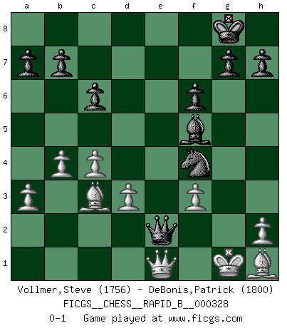 Last move : 0-1 2019 December 14 20:9:14 [Event "FICGS__CHESS__RAPID_B__000328"] [Site "FICGS"] [Date "2019.10.28"] [Round "1"] [White "Vollmer,Steve"] [Black "DeBonis,Patrick"] [Result "0-1"] [WhiteElo "1756"] [BlackElo "1800"] 1.c4 e5 2.Nc3 Nf6 3.g3 Bb4 4.Bg2 O-O 5.Nf3 Re8 6.O-O c6 7.d3 Na6 8.Qc2 d5 9.a3 Bxc3 10.Qxc3 d4 11.Qc2 Bg4 12.b4 Qd7 13.Bg5 Nh5 14.Rfe1 Nc7 15.Bd2 Bh3 16.Bh1 f6 17.Rad1 Nf4 18.Nxd4 Qxd4 19.gxf4 Ne6 20.e3 Qd7 21.f3 exf4 22.Bc3 fxe3 23.Rxe3 Qf7 24.Qf2 Nf4 25.Rde1 Rxe3 26.Rxe3 Re8 27.Rxe8+ Qxe8 28.Qd2 Qe2 29.Qe1 Bf5 0-1 English : Bremen, Smyslov system Kingside Castling by player Black (move 4) Kingside Castling by player White (move 6) Player Black won this chess game. Follow this game move after move (download)Discovered check is the dive bomber of the Chessboard. (Reuben Fine) Ich bin der einzige Schachspieler, der sich während der Vorbereitungen zum Turnier verletzt hat. (Woody Allen) No hay un Gran Maestro de Ajedrez que sea normal; solo se diferencían ellos por la magnitud de su locura. (Viktor Korchnoi) Vous savez, camarade Pachman, je n'éprouve pas de plaisir à être ministre, je jouerais plutôt aux échecs comme vous, ou alors ferais une révolution au Venezuela. (Che Guevara à Ludek Pachman, 'Checkmate in Prague', 1975) Everybody lies. (Gregory House, House M.D.)