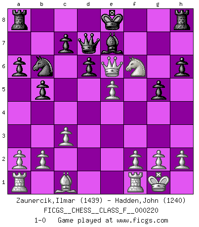 Last move : 1-0 2019 December 23 2:11:40 [Event "FICGS__CHESS__CLASS_F__000220"] [Site "FICGS"] [Date "2019.10.28"] [Round "1"] [White "Zaunercik,Ilmar"] [Black "Hadden,John"] [Result "1-0"] [WhiteElo "1439"] [BlackElo "1240"] 1.e4 e5 2.Nf3 Nc6 3.Bb5 a6 4.Ba4 b5 5.Bb3 h6 6.O-O d6 7.c3 Be6 8.d4 exd4 9.Nxd4 Nxd4 10.Qxd4 Nf6 11.Bxe6 fxe6 12.e5 Nd5 13.Nd2 Be7 14.Qg4 g5 15.Qxe6 Nb6 16.Ne4 Qd7 17.Nf6+ 1-0 Ruy Lopez : Caro variation Kingside Castling by player White (move 6) Player White won this chess game. Follow this game move after move (download)Fischer wanted to give the Russians a taste of their own medicine. (Larry Evans) Konzentriere dich auf materielle Gewinne. Nimm, was dir dein Gegner gibt, ausser es gibt einen guten Grund der dagegenspricht. (Robert James Fischer) En manos de Fischer's, una diminuta ventaja teórica es tan buena como tener una Reina de ventaja. (Isaac Kashdan) Karpov est une pièce de musée. (Garry Kasparov) There's no money in correspondence chess. (John Knudsen)