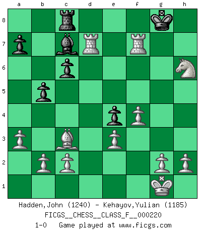 Last move : 1-0 2020 March 1 18:3:35 [Event "FICGS__CHESS__CLASS_F__000220"] [Site "FICGS"] [Date "2019.10.28"] [Round "1"] [White "Hadden,John"] [Black "Kehayov,Yulian"] [Result "1-0"] [WhiteElo "1240"] [BlackElo "1185"] 1.d4 d5 2.Nf3 e6 3.Nc3 Nc6 4.e3 Nf6 5.Bd3 Be7 6.Bd2 O-O 7.a3 Bd6 8.Qe2 Re8 9.O-O e5 10.dxe5 Nxe5 11.Nxe5 Bxe5 12.Rad1 c6 13.f4 Bc7 14.Rf3 h6 15.Qe1 Ne4 16.Bxe4 dxe4 17.Rg3 f5 18.Qe2 Be6 19.Qh5 Qd7 20.Qxh6 Re7 21.Rh3 gxh6 22.Rxh6 Rg7 23.Ne2 Bf7 24.Rh3 Qe6 25.Nd4 Qd7 26.Bc3 Rh7 27.Rg3+ Kh8 28.Nxf5 Rg7 29.Rxd7 Rc8 30.Rxg7 b5 31.Rgxf7 Kg8 32.Nh6+ 1-0 Queen's pawn game Kingside Castling by player Black (move 6) Kingside Castling by player White (move 9) Player White won this chess game. Follow this game move after move (download)Becoming successful at Chess allows you to discover your own personality. That's what I want for the kids I teach. (Saudin Robovic) Ein Isolani verdüstert die Stimmung auf dem ganzen Schachbrett. (Savielly Grigorievitsch Tartakower) El Ajedrez es 99 por ciento táctica. (Teichmann) Botvinnik disait en comparant les échecs à la musique: Il existe une science dont le but est l'étude de l'acoustique et des sons. Mais il y a aussi un art qui se sert de l'océan des sons : c'est la musique. De toute évidence, il en est de même pour la pensée. La logique est l'étude des lois de la réflexion et les échecs reflètent, en tant qu'art, le côté logique de la réflexion, sous la forme d'images artistiques... Extrait de Fischer - Spassky, Reykjavik 1972 par Alexander & F. Wyndham (Ed. Solar), p 37. A cynic is a man who knows the price of everything but the value of nothing. (Oscar Wilde)