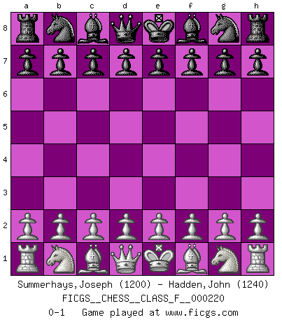 Last move : 0-1 2019 December 8 0:12:23 [Event "FICGS__CHESS__CLASS_F__000220"] [Site "FICGS"] [Date "2019.10.28"] [Round "1"] [White "Summerhays,Joseph"] [Black "Hadden,John"] [Result "0-1"] [WhiteElo "1200"] [BlackElo "1240"] 0-1 This chess game has been lost on time (started : 2019.10.28 22:57:10) Player Black won this chess game. Follow this game move after move (download)Chess is the art which expresses the science of logic. (Mikhail Botvinnik) Alles was ich jemals tun will ist Schach spielen. (Robert James Fischer) El Ajedrez es un terrible juego. Si no controlas el centro, tu oponente tiene una posición mas holgada. Si tienes control del centro, ¡entonces realmente tu tienes algo de que preocuparte!. (Siegbert Tarrasch) Aidez vos pièces, elles vous aideront. (Paul Morphy) Beta. Software undergoes beta testing shortly before it's released. Beta is latin for still doesn't work. (Anonymous)