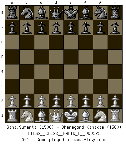 Last move : 0-1 2019 November 30 0:49:50 [Event "FICGS__CHESS__RAPID_C__000225"] [Site "FICGS"] [Date "2019.10.30"] [Round "1"] [White "Saha,Sumanta"] [Black "Dhanagond,Kanakaa"] [Result "0-1"] [WhiteElo "1500"] [BlackElo "1500"] 0-1 This chess game has been lost on time (started : 2019.10.30 18:8:52) Player Black won this chess game. Follow this game move after move (download)If your opponent cannot do anything active, then don't rush the position; instead you should let him sit there, suffer, and beg you for a draw. (Jeremy Silman) Aljechin war kein Nazi. Er war ein Opportunist. Ein schrecklicher Mann. Er liebte Geld über alles und würde für Geld ein Jude, ein Katolik oder ein Protestant werden. (Miguel Najdorf) Preferería tener un Peón que un dedo. (Reuben Fine) Karpov est une pièce de musée. (Garry Kasparov) How many people work in NATO Headquarters ? - About half of them. (Dirk Stikker, NATO general secretary)