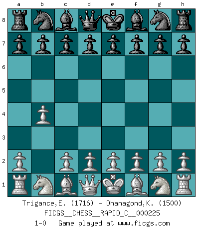 Last move : 1-0 2019 November 30 0:49:50 [Event "FICGS__CHESS__RAPID_C__000225"] [Site "FICGS"] [Date "2019.10.30"] [Round "1"] [White "Trigance,Emile"] [Black "Dhanagond,Kanakaa"] [Result "1-0"] [WhiteElo "1716"] [BlackElo "1500"] 1.b4 1-0 This chess game has been lost on time (started : 2019.10.30 18:8:52) Polish (Sokolsky) opening Player White won this chess game. Follow this game move after move (download)You need not play well - just help your opponent to play badly. (Genrikh Chepukaitis) Offensichtlich kennt Kasparow nichts anderes als Schach, und ich könnte 500 weitere Spieler dieser Sorte benennen. (Judith Polgar) Fischer sacrificó virtualmente todo lo que la mayoría de nosotros los 'debiles' (término que él usa) valoramos, respetamos y apreciamos por el amor de un astuto, a menudo hermoso tablero de juego, por el privilegio ambivalente de ser su mas grande maestro. (Paul Kollar) Les Echecs représentent une sphère d'idées créatrices basée sur la volonté des deux protagonistes. (Smyslov) Hold em is to stud what chess is to checkers. (Johnny Moss)