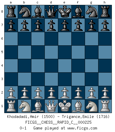 Last move : 0-1 2019 November 30 0:49:50 [Event "FICGS__CHESS__RAPID_C__000225"] [Site "FICGS"] [Date "2019.10.30"] [Round "1"] [White "Khodadadi,Amir"] [Black "Trigance,Emile"] [Result "0-1"] [WhiteElo "1500"] [BlackElo "1716"] 0-1 This chess game has been lost on time (started : 2019.10.30 18:8:52) Player Black won this chess game. Follow this game move after move (download)A great player and a great example for many. His book My 60 Memorable Games had a big impact on me. It is a shame he didn't continue to enrich the world of chess with his unparalleled understanding after 1972. (Jan Timman, about Bobby Fischer's death) Schach ist ein Teil der Kultur, und wenn es mit der Kultur abwärts geht, geht es auch mit dem Schach abwärts. (Mikhail Moiseyevich Botvinik) No hay precio que sea tan grande por la cabellera del Rey enemigo. (Koblentz) On entre au jeu d'Echecs comme on entre en Religion. Pour le joueur d'Echecs, la partie d'Echecs c'est l'office, la messe, le défilé du 1er Mai, le dépôt de gerbe au Monument aux Morts. C'est un drame sacré. (Michel Roos) But they are useless. They can only give you answers. (Pablo Picasso, about computers)