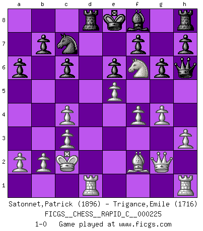 Last move : 1-0 2019 December 19 9:29:43 [Event "FICGS__CHESS__RAPID_C__000225"] [Site "FICGS"] [Date "2019.10.30"] [Round "1"] [White "Satonnet,Patrick"] [Black "Trigance,Emile"] [Result "1-0"] [WhiteElo "1896"] [BlackElo "1716"] 1.e4 c5 2.f4 g6 3.Nf3 Bg7 4.Nc3 Nc6 5.Bb5 a6 6.Bxc6 dxc6 7.d3 Bg4 8.h3 Bxf3 9.Qxf3 e6 10.e5 Ne7 11.Ne4 Nf5 12.g4 Nd4 13.Qg2 Qh4+ 14.Kd1 Qe7 15.c3 Nb5 16.Be3 c4 17.dxc4 Rd8+ 18.Kc2 Nc7 19.Bc5 Qh4 20.Rad1 Bf8 21.Bf2 Qh6 22.Nf6+ 1-0 Sicilian : Grand Prix attack Player White won this chess game. Follow this game move after move (download)If Chess is a science, it's a most inexact one. If Chess is an art, it is too exacting to be seen as one. If Chess is a sport, it's too esoteric. If Chess is a game, it's too demanding to be just a game. If Chess is a mistress, she's a demanding one. If Chess is a passion, it's a rewarding one. If Chess is life, it's a sad one. (Unknown) Man wirke der falschen Auffassung entgegen, als ob jeder Zug Unmittelbares zu leisten habe; auch Werte- und Ruhezüge haben ihre Existenzberechtigung. (Aaron Nimzowitsch) El jugador táctico debe saber que hacer cuando algo se debe de hacer. El estratégico debe saber que hacer cuando nada se debe de hacer. (Savielly Tartakover) Aidez vos pièces, elles vous aideront. (Paul Morphy) I've never seen so many men wasted so badly. (Blondie in The Good, The Bad and The Ugly)