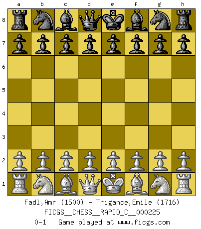 Last move : 0-1 2019 November 30 0:49:50 [Event "FICGS__CHESS__RAPID_C__000225"] [Site "FICGS"] [Date "2019.10.30"] [Round "1"] [White "Fadl,Amr"] [Black "Trigance,Emile"] [Result "0-1"] [WhiteElo "1500"] [BlackElo "1716"] 0-1 This chess game has been lost on time (started : 2019.10.30 18:8:52) Player Black won this chess game. Follow this game move after move (download)I'm not a materialistic person, in that, I don't suffer the lack or loss of money. The absence of worldly goods I don't look back on. For Chess is a way I can be as materialistic as I want without having to sell my soul. (Jamie Walter Adams) Modernes Schach erfordert enorme Anspannung. Es ist für einen normalen Menschen unmöglich das auszuhalten. (Viktor Kortschnoi) El juego de Damas es para vagabundos. (Paul Morphy) D'abord les bases : Jouez et étudiez, puis étudiez et jouez, ensuite jouez et étudiez, puis étudiez et jouez. Deuxièmement : Donnez toujours le meilleur de vous-même ! (Ken Smith) Internal peace cannot coexist with external war. (Don Groves)