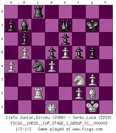 Last move : 1/2-1/2 2020 January 3 8:49:18 [Event "FICGS__CHESS__CUP_STAGE_1_GROUP_01__000003"] [Site "FICGS"] [Date "2019.11.02"] [Round "1"] [White "Cleto Junior,Dirceu"] [Black "Sorbi,Luca"] [Result "1/2-1/2"] [WhiteElo "2088"] [BlackElo "2229"] 1.d4 Nf6 2.c4 e6 3.Nf3 b6 4.g3 Ba6 5.b3 Bb4+ 6.Bd2 Be7 7.Bg2 c6 8.O-O d5 9.Nc3 O-O 10.Bf4 Nbd7 11.cxd5 Nxd5 12.Nxd5 cxd5 13.Qd2 Rc8 14.a4 Nf6 15.Rfc1 Ne4 16.Qe1 g5 17.Rxc8 Qxc8 18.Rc1 Qa8 19.Be3 f6 20.h4 h6 21.Nd2 Nd6 22.b4 Bb7 23.b5 Qd8 24.Nf3 Qd7 25.Bd2 Kg7 26.Bb4 Ra8 27.Qd1 Nc4 28.Bxe7 Qxe7 29.e4 Rc8 30.hxg5 hxg5 31.e5 f5 32.Rc2 1/2-1/2 Queen's Indian : Nimzovich variation (exaggerated Fianchetto) Kingside Castling by player White (move 8) Kingside Castling by player Black (move 9) This chess game ended in a draw. Follow this game move after move (download)I won't play with you anymore. You have insulted my friend. - When an opponent cursed himself for a blunder. (Miguel Najdorf) In Buenos Aires ist es nicht mein vorrangiges Ziel ein starkes Turnier zu organisieren, sondern ein Turnier für Gentlemen. Ich würde nie Kamsky einladen. Ich mag keine Probleme. (Miguel Najdorf) Cada Peón es potencialmente una Reina. (James Mason) Les échecs sont un jeu terrible. Si vous n'avez pas le centre, votre adversaire a une position plus libre. Par contre, si vous avez le centre, alors vous avez vraiment quelque chose pour laquelle vous inquiéter ! (Siegbert Tarrasch) Wikichess, chess moves explained by 'experimented' players. (Thibault de Vassal)