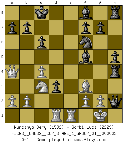 Last move : 0-1 2019 December 18 1:19:45 [Event "FICGS__CHESS__CUP_STAGE_1_GROUP_01__000003"] [Site "FICGS"] [Date "2019.11.02"] [Round "1"] [White "Nurcahyo,Dery"] [Black "Sorbi,Luca"] [Result "0-1"] [WhiteElo "1592"] [BlackElo "2229"] 1.e4 e5 2.c3 Nf6 3.d3 d5 4.exd5 Qxd5 5.Nf3 Nc6 6.Be3 Bf5 7.c4 Qa5+ 8.Nc3 O-O-O 9.Be2 e4 10.Nd4 Nxd4 11.Bxd4 Rxd4 12.O-O exd3 13.Bf3 h5 14.Qb3 c6 15.Rfe1 Qc7 16.Rad1 Rh4 17.Qa4 Qxh2+ 0-1 Variation Lopez Opening : Lopez Opening Queenside Castling by player Black (move 8) Kingside Castling by player White (move 12) Player Black won this chess game. Follow this game move after move (download)The essence of Chess is thinking about what Chess is. (David Bronstein) Herr Iljumschinow ist ein etwas merkwürdiger Geschäftsmann: Er arbeitet zusammen mit Leuten wie Muammar al-Gaddafi; früher ist das Saddam Hussein gewesen. (Joel Lautier) Entre mas años cumplo, mas valoro los Peones. (Keres) Roi des jeux et jeu des rois, les échecs portent en eux un sentiment d'infini. Ils donnent à celui qui s'est efforcé d'en approfondir les arcanes l'impression de n'être pas à la mesure de l'homme; en fait, ils constituent un résumé de l'univers, un microcosme, et figurent cette grande échelle qui, dans les plans de la lumière descend jusqu'à la matière, qui des abîmes insondables remonte jusqu'en l'infini de Dieu. (Pyrame) Is not life a hundred times too short to bore ourselves ? (Friedrich Nietzsche)