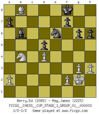 Last move : 1/2-1/2 2019 November 29 18:5:51 [Event "FICGS__CHESS__CUP_STAGE_1_GROUP_01__000003"] [Site "FICGS"] [Date "2019.11.02"] [Round "1"] [White "Berry,Ed"] [Black "Mag,James"] [Result "1/2-1/2"] [WhiteElo "2085"] [BlackElo "2225"] 1.d4 Nf6 2.c4 e6 3.Nf3 b6 4.g3 Ba6 5.b3 Bb4+ 6.Bd2 Be7 7.Bg2 d5 8.cxd5 exd5 9.Nc3 O-O 10.O-O Nbd7 11.Ne5 Bb7 12.Qc2 c6 13.Nd3 Rc8 14.b4 c5 15.bxc5 bxc5 16.Nb5 cxd4 17.Qb2 Ba6 18.Nxd4 Re8 19.Rac1 Qb6 20.Rxc8 Rxc8 21.Nb3 Nc5 22.Rc1 Nxd3 23.Rxc8+ Bxc8 24.exd3 Qa6 25.Bf1 h6 26.Be3 Bd8 27.Nc5 Qc6 28.h3 Bb6 29.Bg2 Bf5 30.d4 Qc8 31.Kh2 Be4 32.Qb5 Bxg2 33.Kxg2 Qe8 34.Qxe8+ Nxe8 35.Nd3 Kf8 36.Nb4 Nc7 37.Bf4 Ne6 38.Bb8 g6 1/2-1/2 Queen's Indian : Nimzovich variation (exaggerated Fianchetto) Kingside Castling by player Black (move 9) Kingside Castling by player White (move 10) This chess game ended in a draw. Follow this game move after move (download)You know, comrade Pachman, I don't enjoy being a Minister, I would rather play Chess like you. (Che Guevara) Es tut gut, die Entwicklungsperiode von, [...] demokratischem Geist durchdringen zu lassen. Wie undemokratisch wäre es doch beispielsweise, den einen Offizier große Spaziertouren vornehmen zu lassen, während die anderen zu Hause säßen und sich entsetzlich langweilten. (Aaron Nimzowitsch) Las combinaciones han sido siempre el aspecto más intrigante del Ajedrez. Los Maestros las buscan, el público las aplauden, los críticos las alaban. La razón se debe a que las combinaciones hacen posible que el Ajedrez sea más que un ejercicio matemático con una carencia de vida. Ellas son la poesía del juego, son del Ajedrez lo que la melodía es de la música. Ellas representan el triunfo de la mente sobre la materia. (Reuben Fine) Il s'avisa de me proposer d'apprendre les échecs qu'il jouait un peu... me voilà forcené des échecs. J'achète un échiquier, je m'enferme dans ma chambre, j'y passe des jours et des nuits à vouloir apprendre par cur toutes les parties. (Jean-Jacques Rousseau, Confessions) In fact if nothing is done against this teddy bear, hereby I announce that I would quit chess, rapid chess, blitz chess, postal chess, email chess, server chess and correspondence chess I will then switch to a table game where teddy bears aren't going to be seen for a while, like Poker, or Roulette, all 18+ games. (Elmer Valderrama)