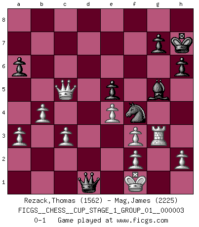 Last move : 0-1 2019 December 8 18:41:8 [Event "FICGS__CHESS__CUP_STAGE_1_GROUP_01__000003"] [Site "FICGS"] [Date "2019.11.02"] [Round "1"] [White "Rezack,Thomas"] [Black "Mag,James"] [Result "0-1"] [WhiteElo "1562"] [BlackElo "2225"] 1.e4 c5 2.Nf3 d6 3.d4 cxd4 4.Nxd4 Nf6 5.Nc3 a6 6.Be3 e5 7.Nf3 Be7 8.Bc4 Nc6 9.O-O O-O 10.Qe2 Na5 11.Bd5 Be6 12.Bxe6 fxe6 13.Na4 h6 14.Nb6 Rb8 15.Rad1 Ng4 16.b4 Nc6 17.a3 Nxe3 18.Qxe3 Rxf3 19.gxf3 Bg5 20.Qb3 Qxb6 21.Qxe6+ Kh8 22.Rxd6 Rf8 23.c3 Qb5 24.Qd7 Qe2 25.Rg6 Bf6 26.Qxb7 Kh7 27.Rg3 Ne7 28.Qa7 Ng6 29.Qe3 Qc4 30.Rd1 Qb3 31.Ra1 Bg5 32.Qc5 Rd8 33.Kg2 Rd1 34.Rxd1 Nf4+ 35.Kf1 Qxd1+ 0-1 Sicilian : Najdorf, Byrne (English) attack Kingside Castling by player White (move 9) Kingside Castling by player Black (move 9) Player Black won this chess game. Follow this game move after move (download)A good player is always lucky. (Jose Raul Capablanca) Deine Wertungszahl - vorausgesetzt einige Jahre schachliche Anstrengung - entspricht etwa dem zehnfachen Deines IQ plus 1000. (Jonathan Levitt) Hoy en día, si tu no eres un Gran Maestro a los 14 años, es mejor que lo olvides. (Anand Viswanathan) Le pion, dans sa simplicité, marche droit devant lui, mais lorsqu'il prend, il le fait obliquement? Ainsi l'homme, tant qu'il reste pauvre, marche dans la droiture et vit honnêtement, mais lorsqu'il recherche les honneurs, il flatte, se parjure et, par les voies obliques, cherche une position supérieure sur l'échiquier du monde. (Jean de Galles) I teach you to lie, cheat and steal, and as soon as my back's turned you wait in line ? (Gregory House, House M.D.)